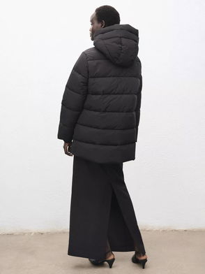 Quilted design, Oversize design, Midi design, Turtleneck, Long sleeve, Elastic cuffs, Loops, Removable belt, Side pockets, Zip fastening on the front section, Press stud fastening, Back length 43.7 in.