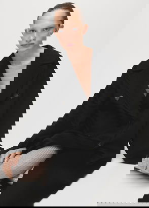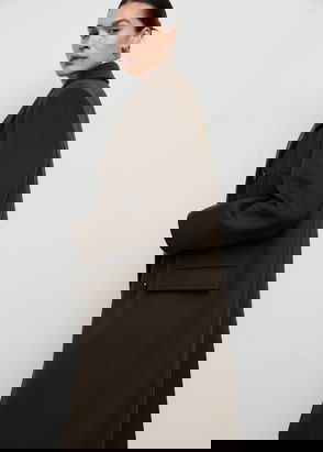 Oversize design, Lapel-collar, Long sleeve with buttoned cuffs, Button fastening on the front section, Midi design, Two-buttoned flap chest pockets, Fabric with wool.