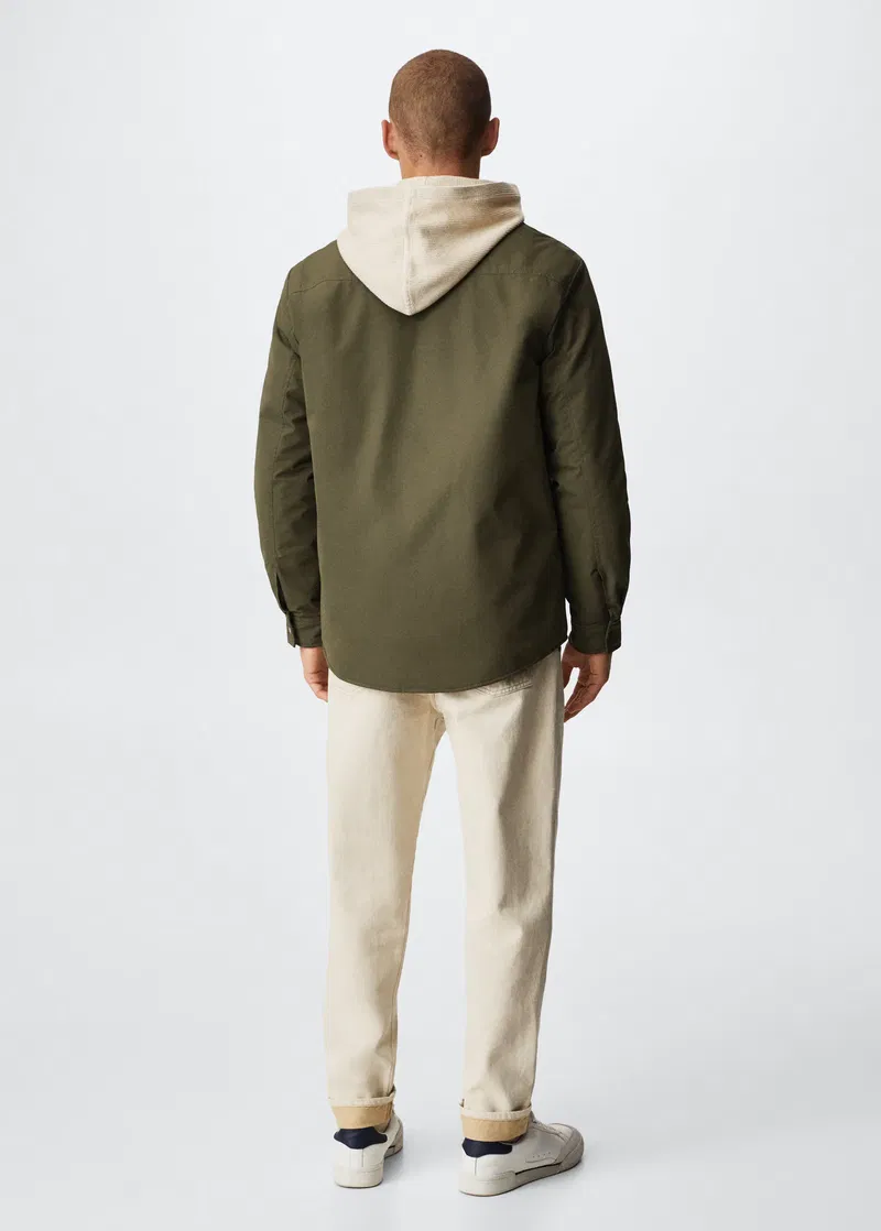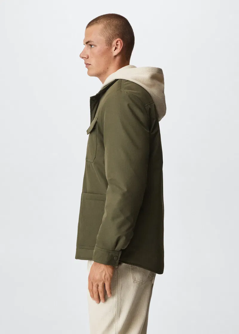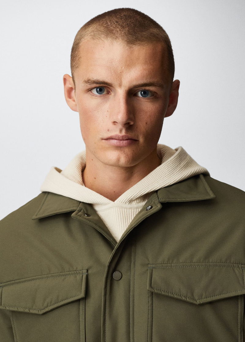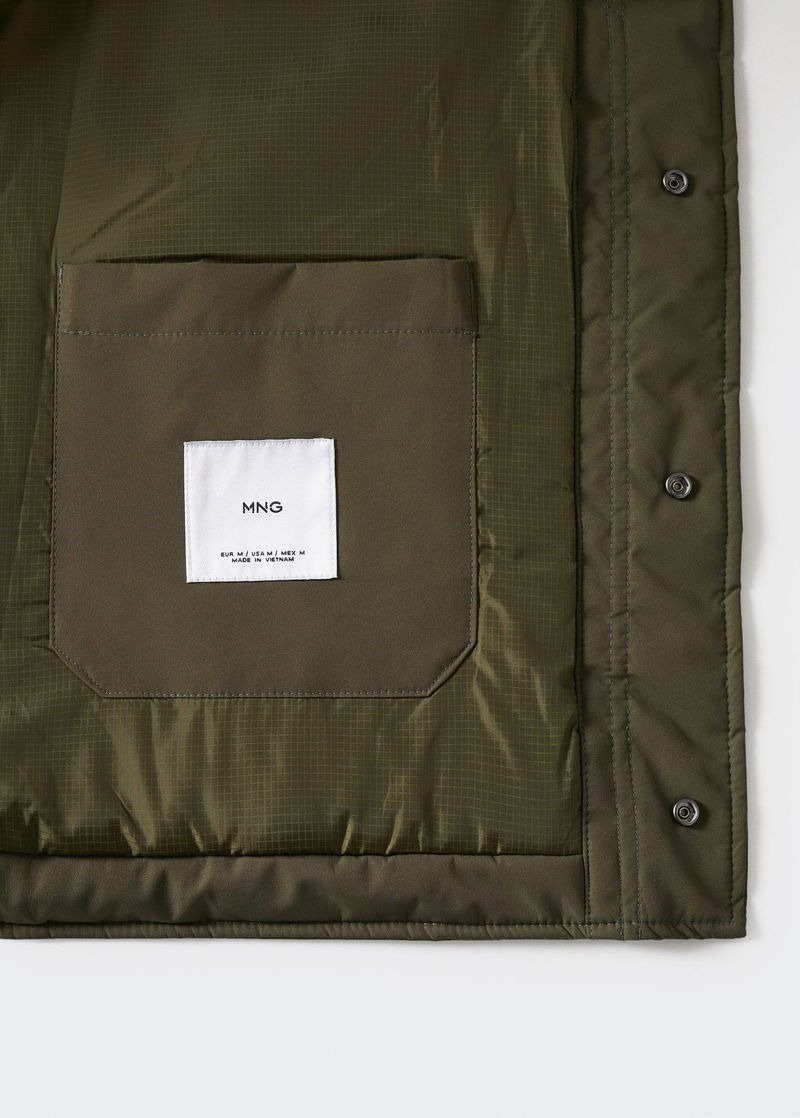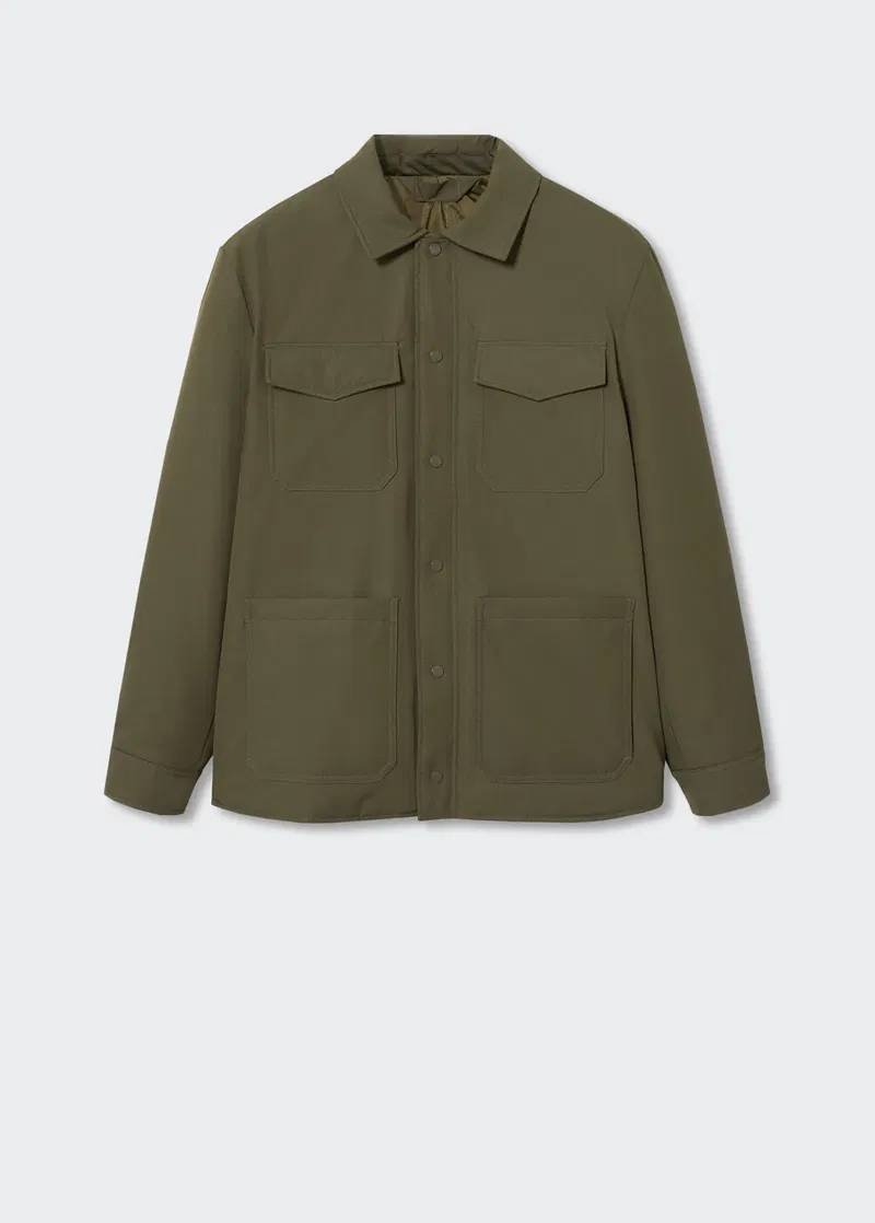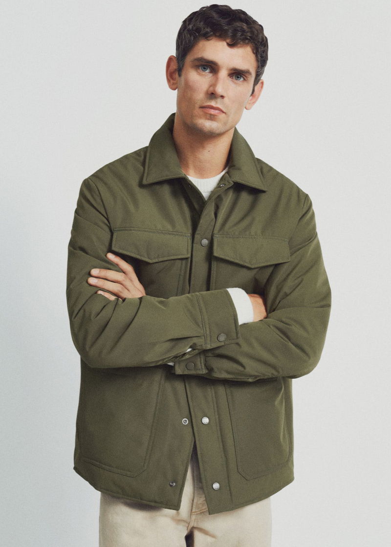 Quilted design, Water Repellent technical fabric, Windproof fabric, Thermoregulating fabric: regulates body temperature, Recycled polyester padding, Shirt-style collar, Long sleeve, Two chest pockets with flaps, Two patch pockets on the front, Button up.