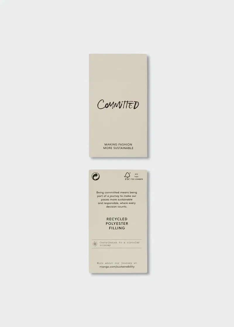 The garments labelled as Committed are products that have been produced using sustainable fibres or processes, reducing their environmental impact. Mango's goal is to support the implementation of practices more committed to the environment, and therefore increase the number of sustainable garments in the collection.