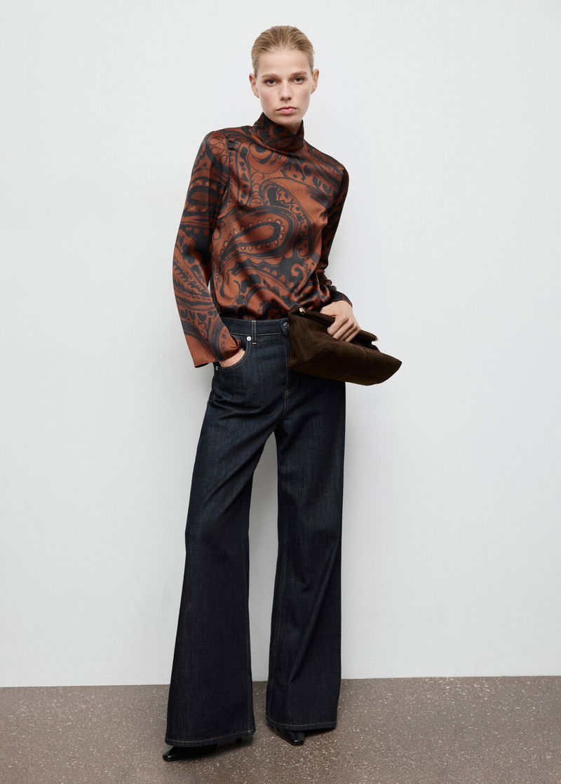 Fluid fabric with satin finish. Straight Design. Funnel neck. Paisley print. Long sleeve. Button fastening on the back section.