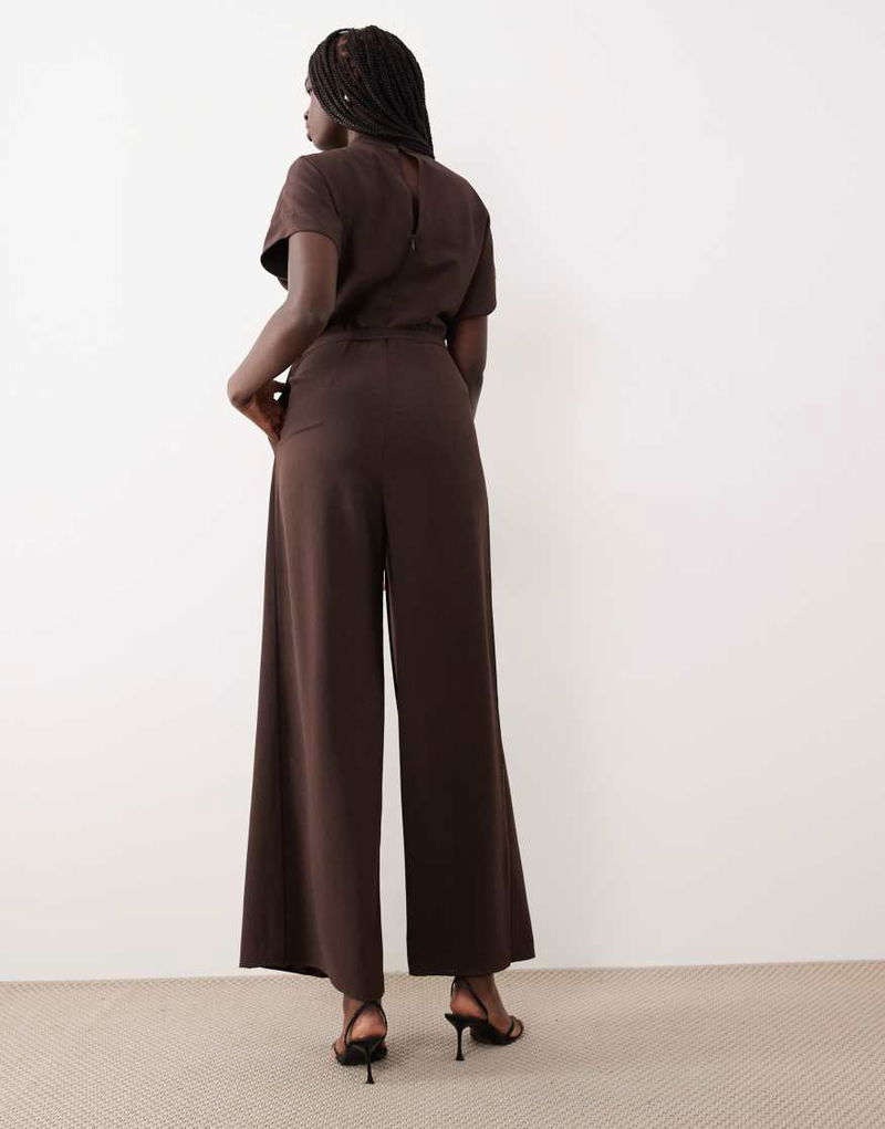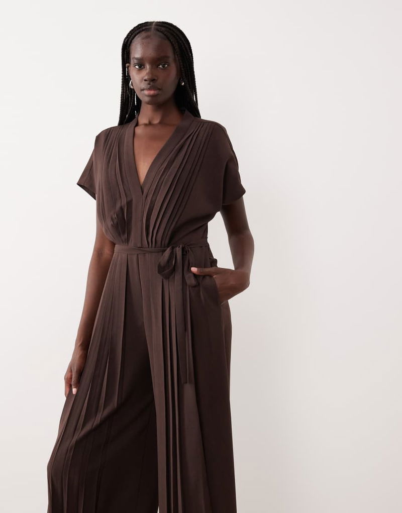 Pleat Detail Short Sleeve Jumpsuit In Chocolate