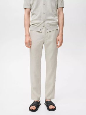 Performance Collection. Perfect for those seeking a functional and comfortable garment. Thermoregulating: This fabric offers optimal breathability to keep you at a stable temperature. Fabric blend of viscose and linen. Straight-fit. Belt loops. Adjustable elastic waist. Front fastening with double-breasted buttons and zip. Two side pockets. Two rear welt pockets with snap button closures. Front pleat detail. Ironed stripe detail at front and back. Set available as total look.
