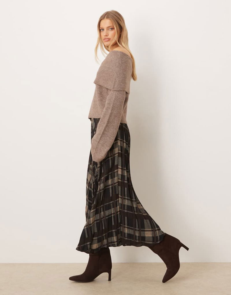 Pleated Maxi Skirt In Brown Check