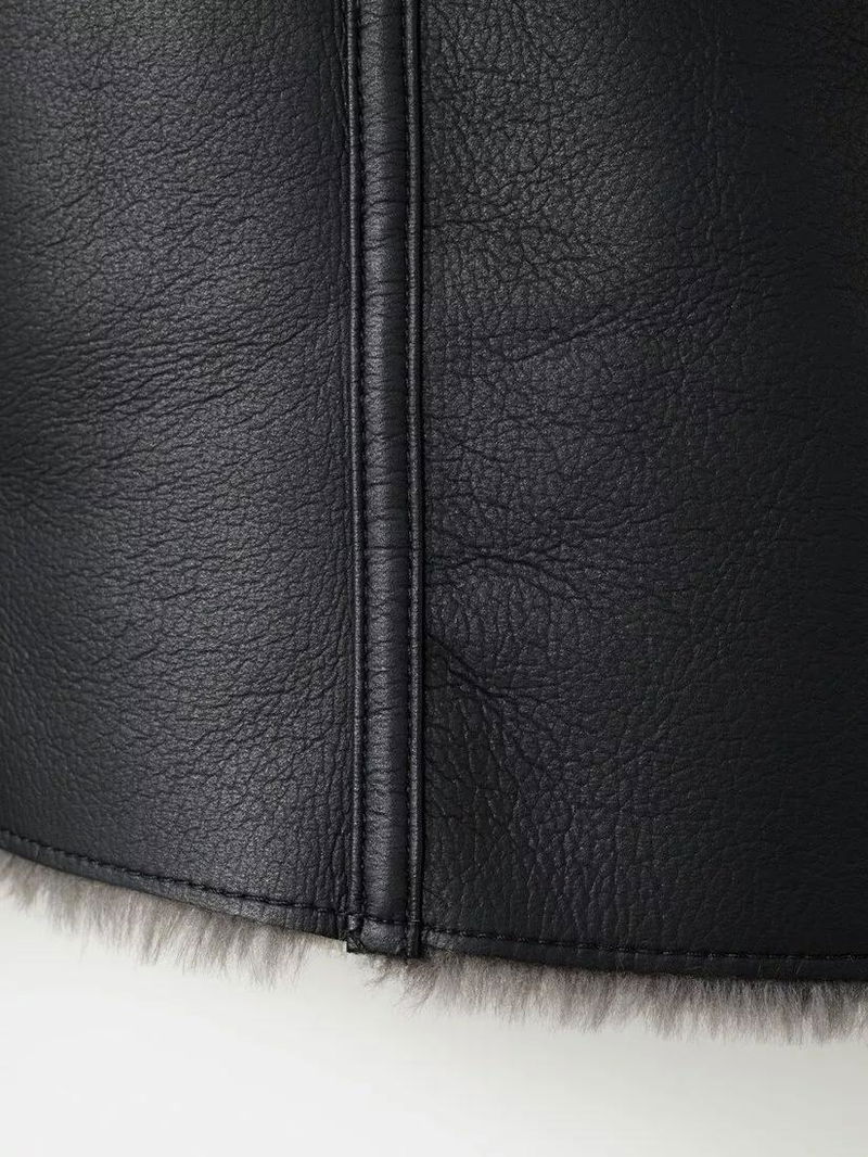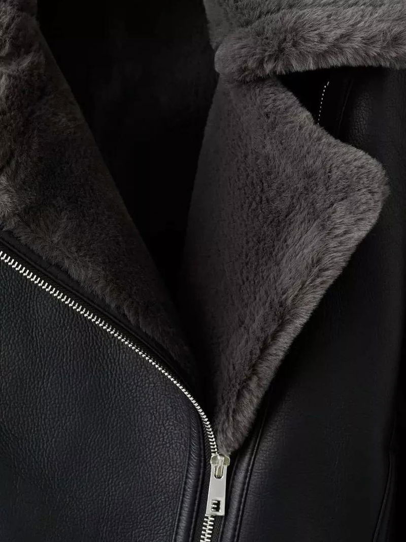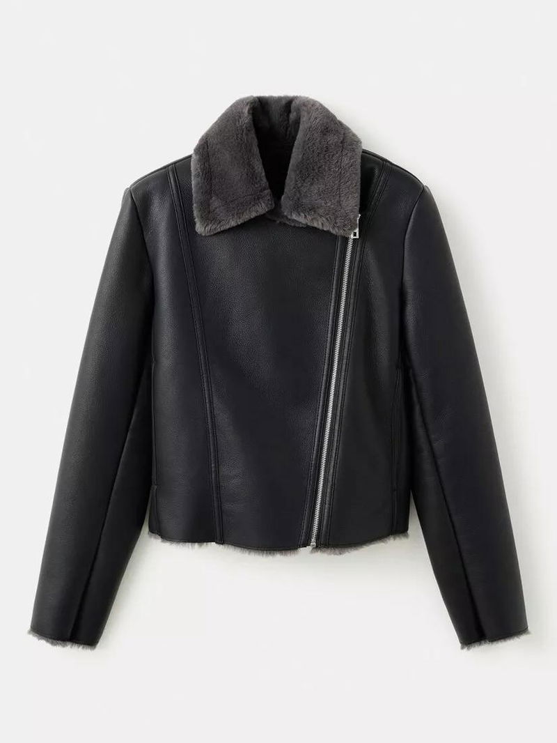 Plush Collar Faux Leather Biker Jacket, Black