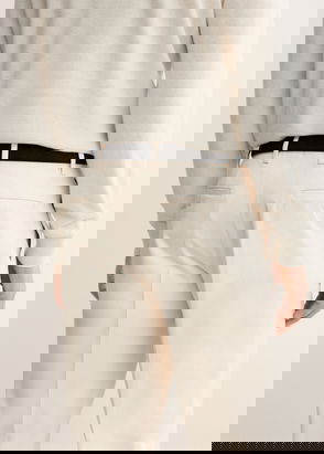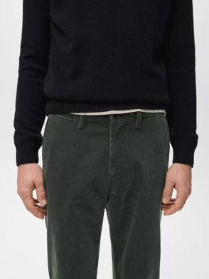 Regular rise. Belt loops. Concealed fly. Side pockets. Straight fit.