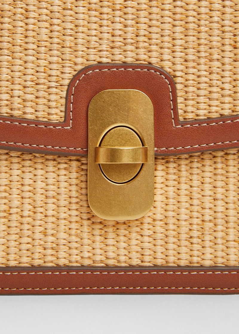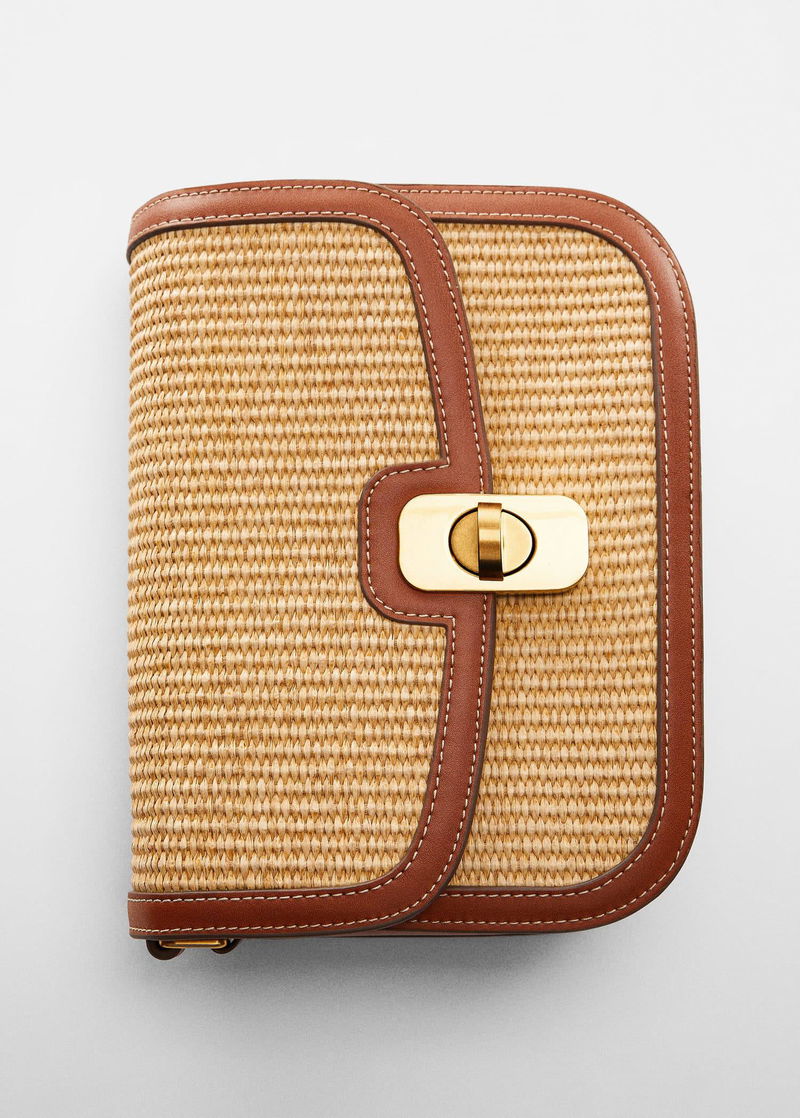 Medium, Cotton-blend fabric, Raffia effect, Crossbody bag, Long adjustable strap, Dual compartment, Metallic twist clasp fastening, Inner lining.