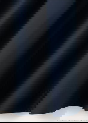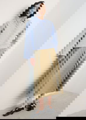 Long design. A-line design. Pleated panel at the waist. Side zip closure.