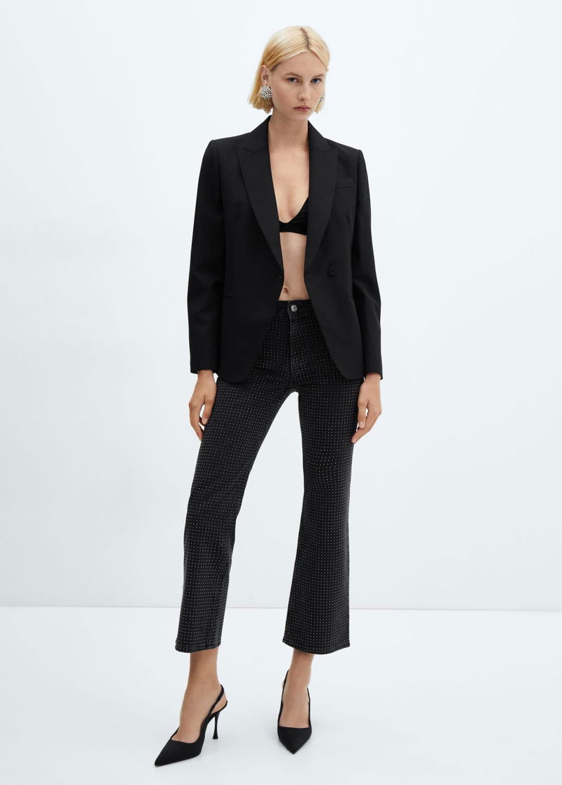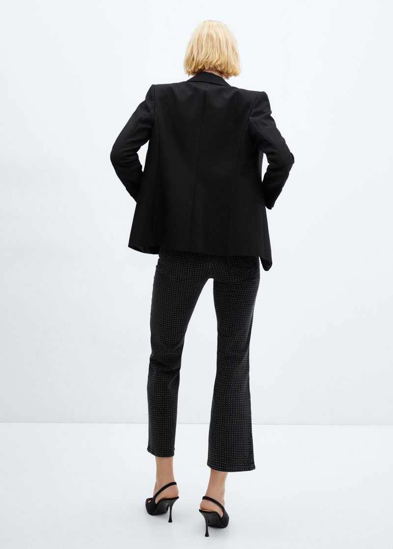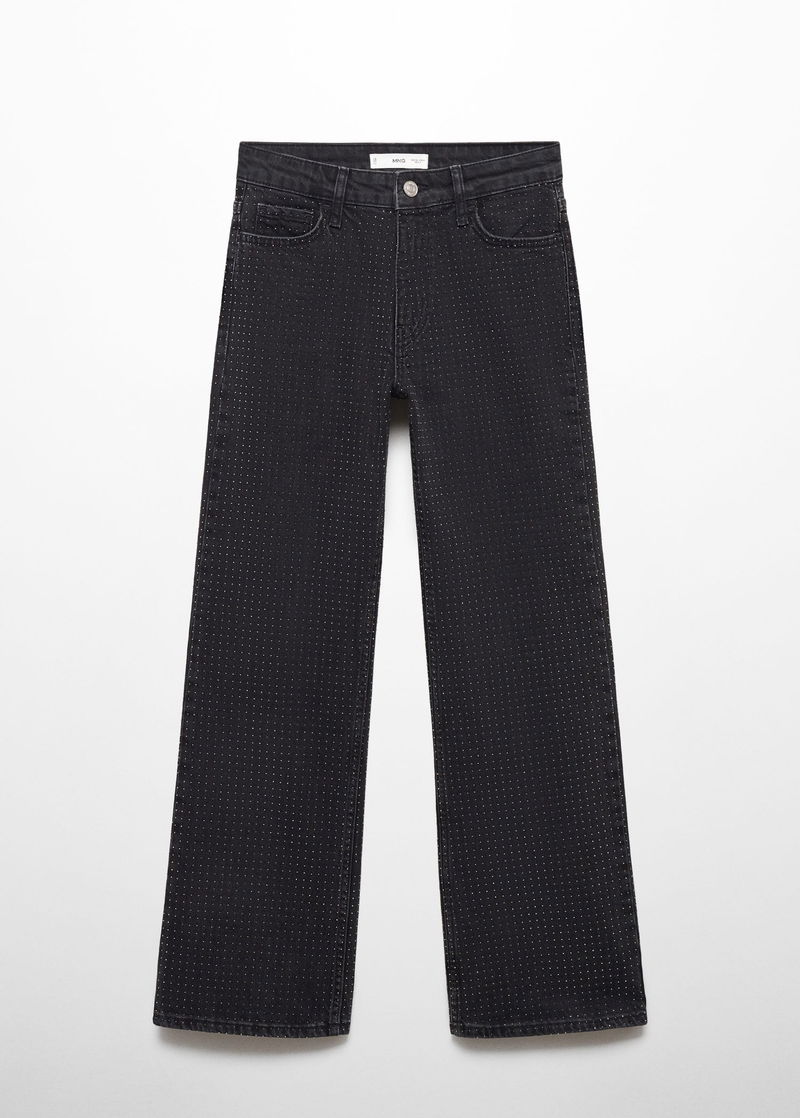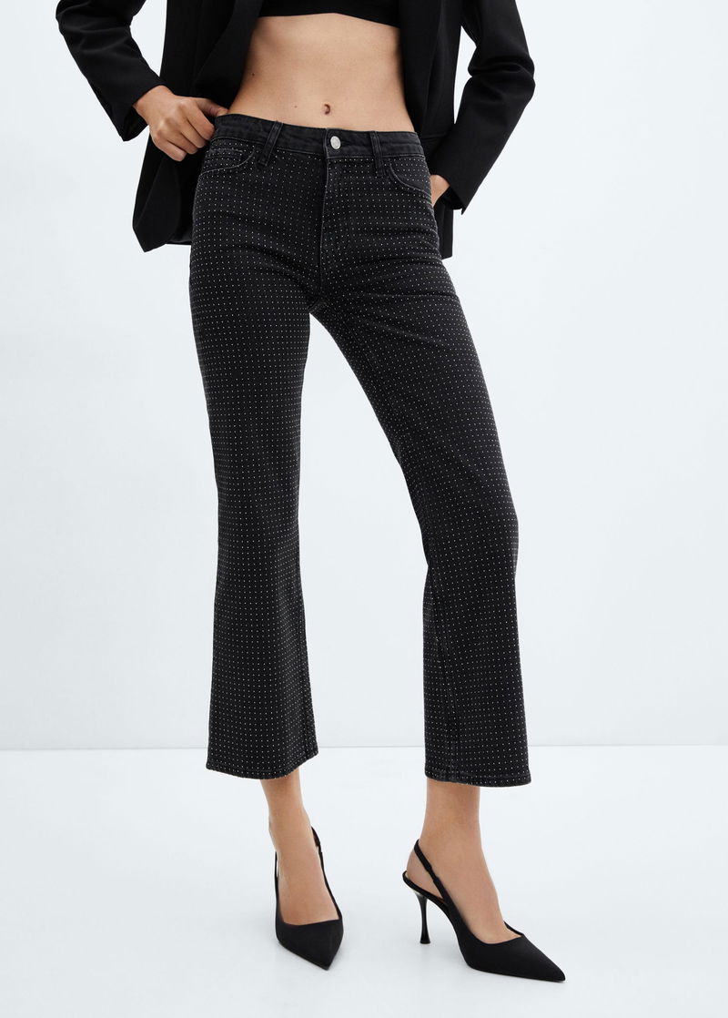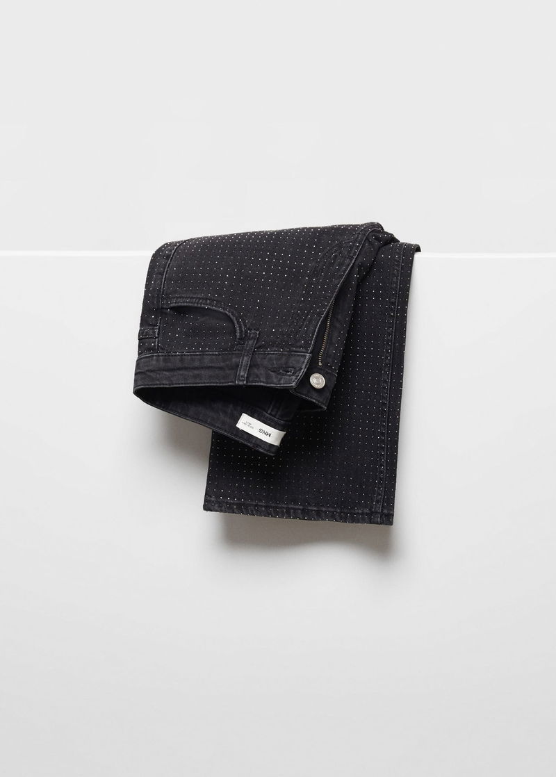 Denim style cotton fabric, Flare design, Medium waist, Five pockets, Zip and one button fastening, Sparkly decorative appliqués, Loops.