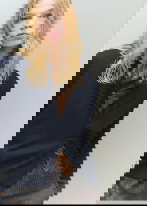 Rib knit fabric, Cropped design, Straight design, V-neck, Long sleeve, Button fastening on the front.