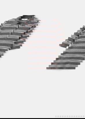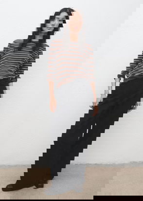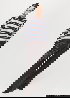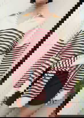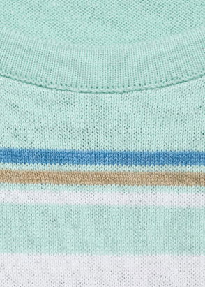 Fine knit fabric, Straight design, Striped print, Round neck, Long sleeve, Cable knit finish.