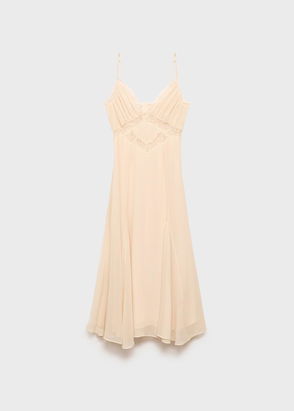 Satin fabric. Midi design. Straight Design. Lingerie style. V-neckline. Sleeveless. Thin straps. Open back with tie. Lace details. Side opening at the hem. No fastening. Selection Collection.