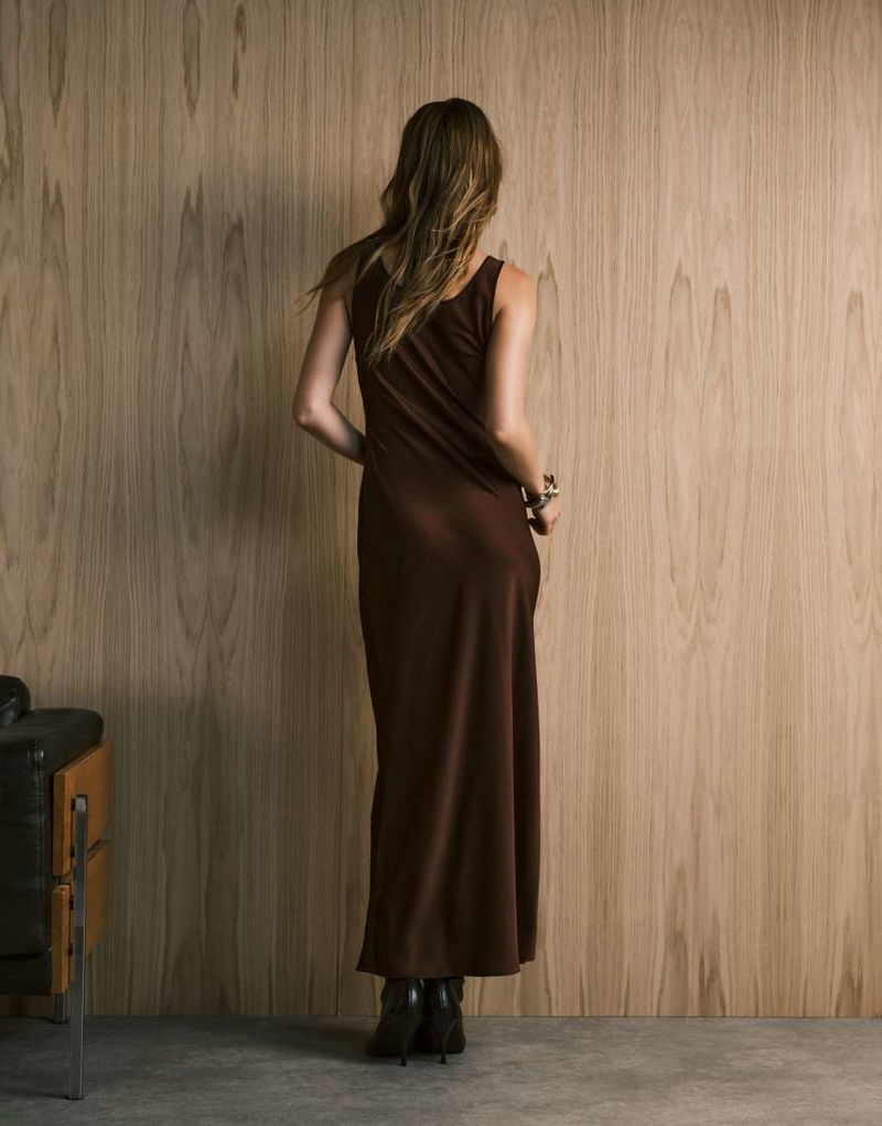 Satin Scoop Neck Midi Dress In Brown