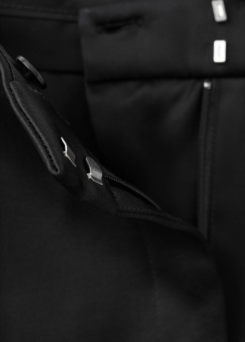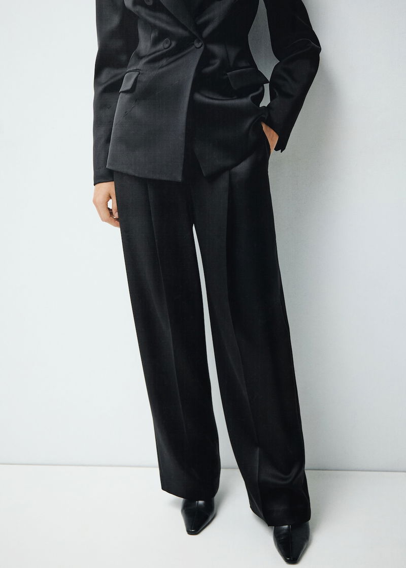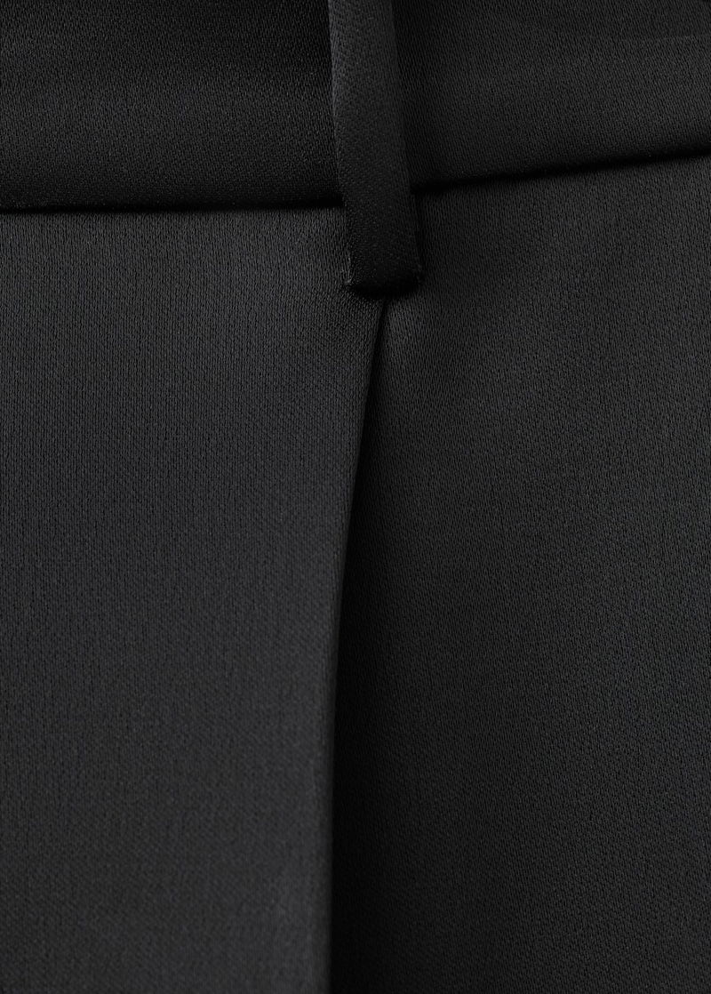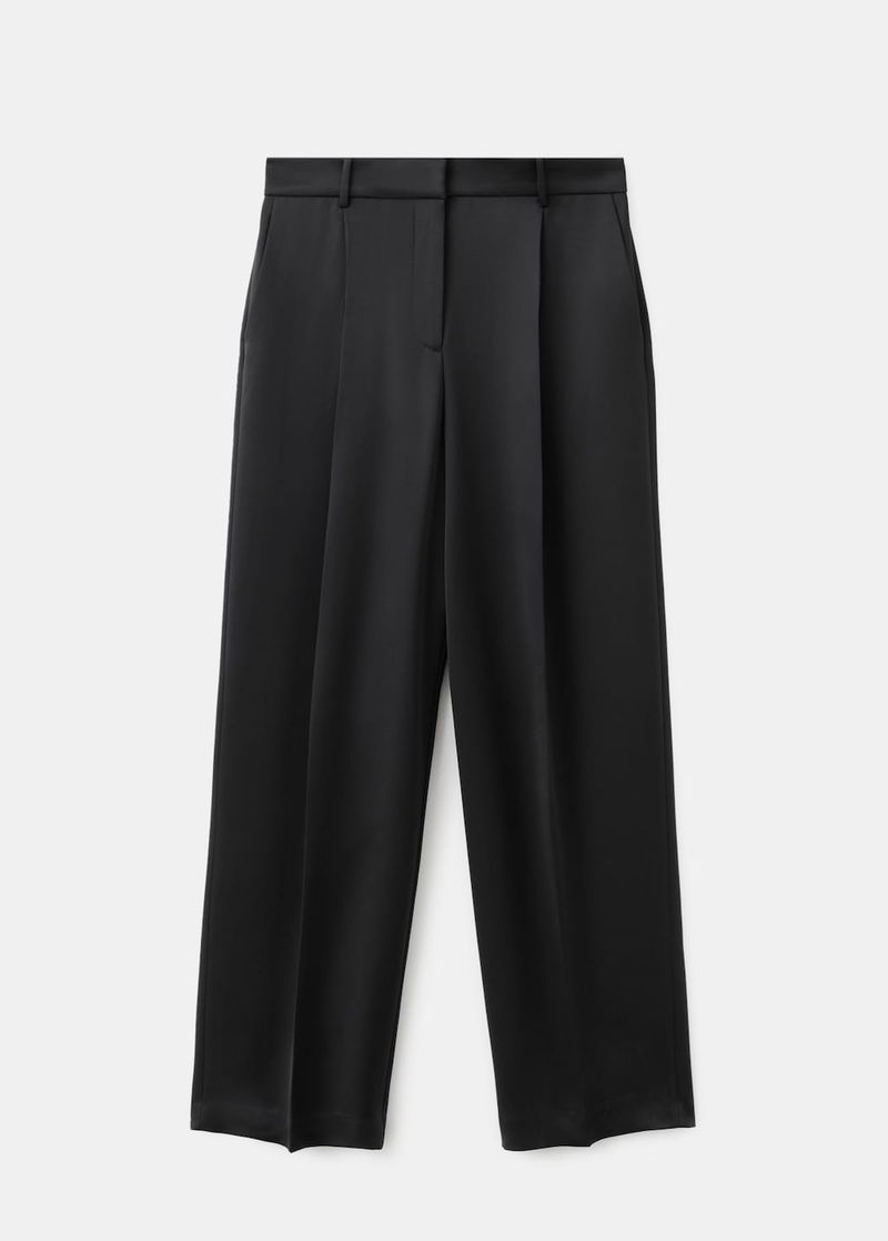 Satin fabric. Long design. Straight Design. Mid-rise. Belt loops. Two side pockets. Two welt pockets at the back. Front pleat detail. Concealed button, hook and zip fastening. Total look.