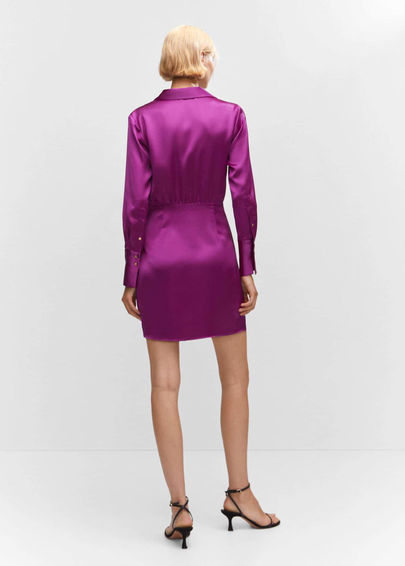 Satin, Flowy fabric, Shirt-style, Crossover design, Straight design, Short design, Shirt-style collar, Wrap collar, Long buttoned sleeve, Unclosed, Party and events collection.