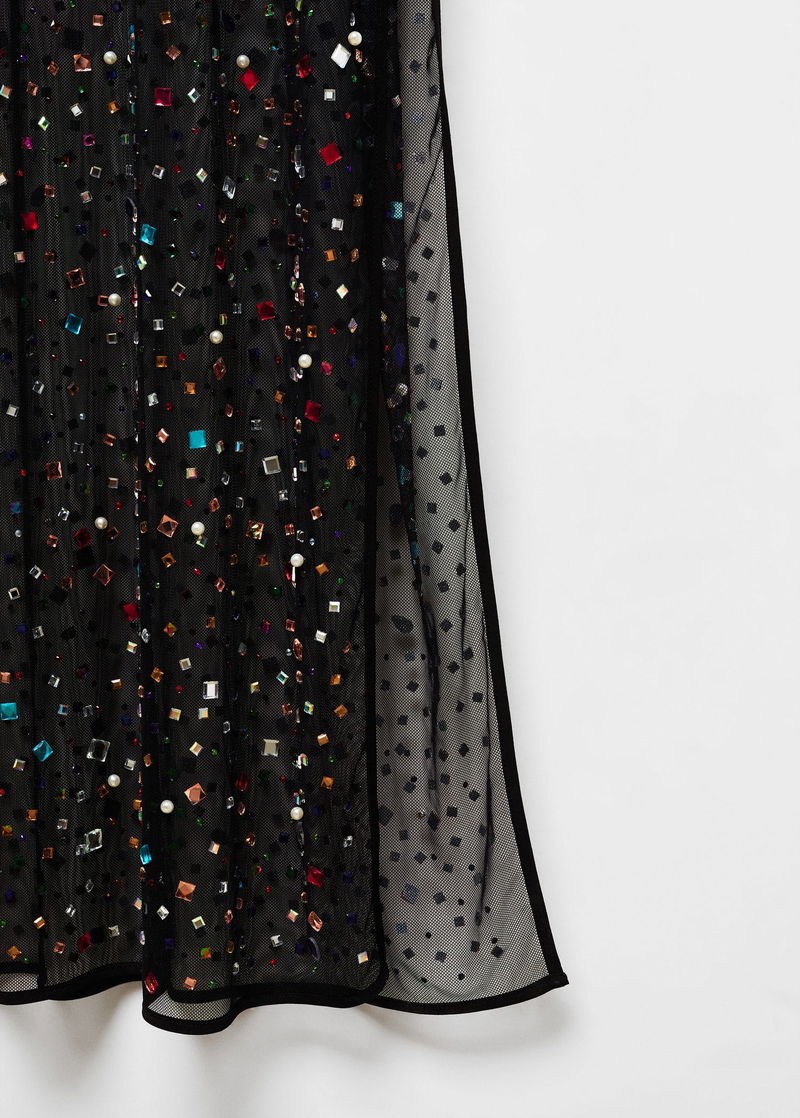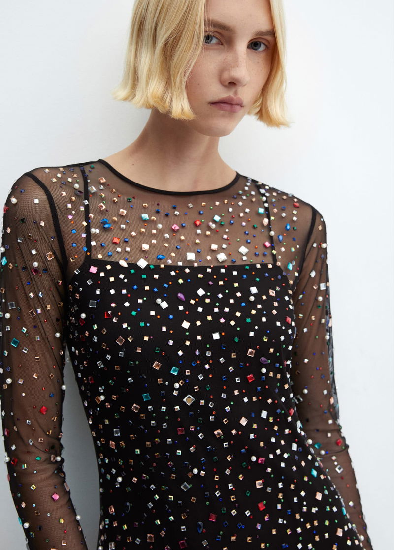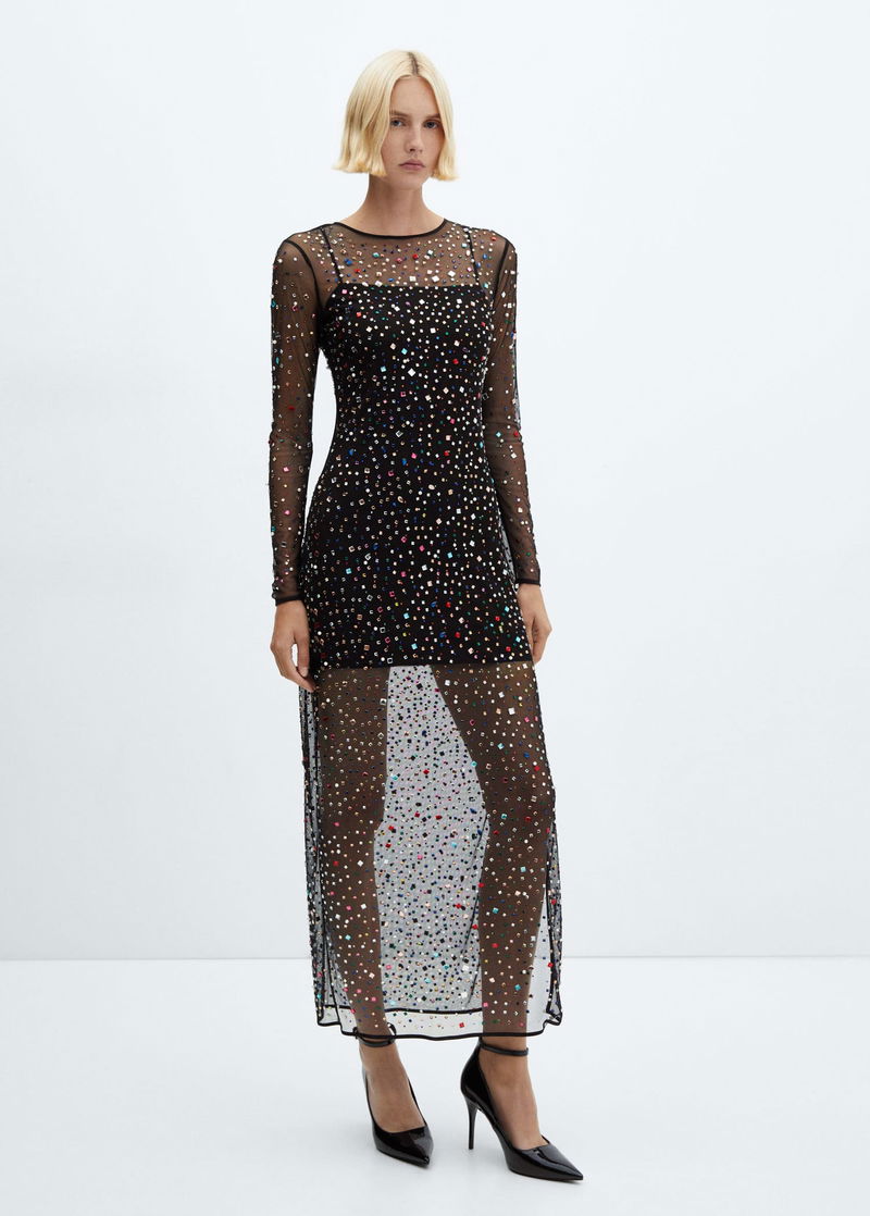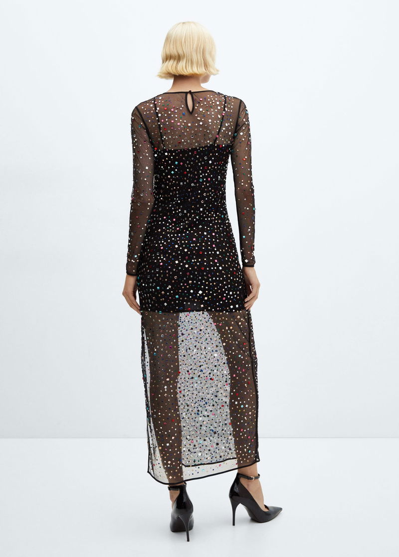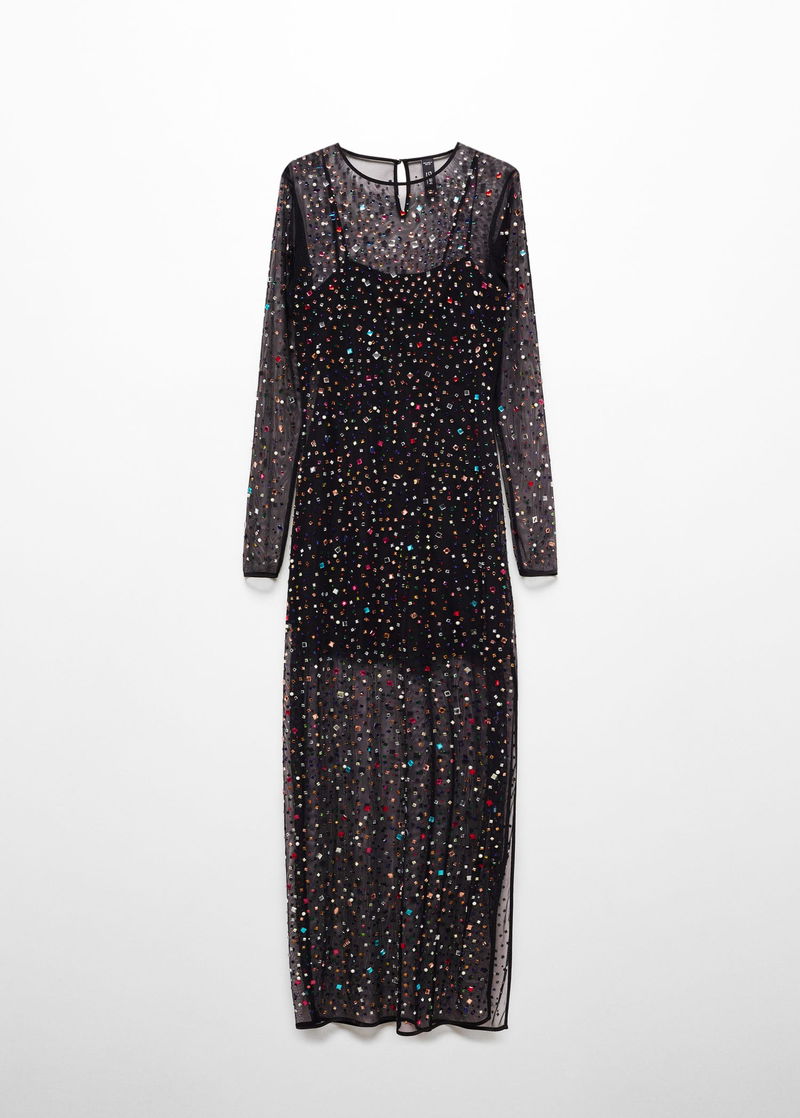 Mesh fabric, long design, tailored design, rounded neck, long sleeve, teardrop fastening at back, large rhinestone appliques, side opening at the hem, inner lining, party and events collection.