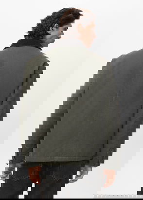 Denim style cotton fabric, Faux shearling collar, Faux shearling interior, Two patch pockets with flaps on the chest, Two welt pockets on the front, Long sleeve with buttoned cuffs, Front closure, Inner pocket, Straight hem, Adjustable waistband with straps and buttons on both sides of the hips.