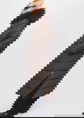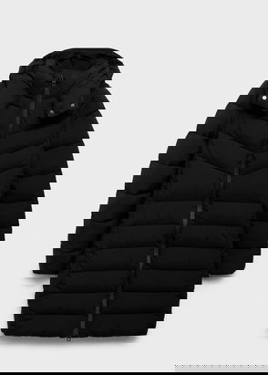 Nylon fabric. Quilted design. Straight design. Turtleneck. Long sleeve. Two side pockets. Concealed zip and button fastening.
