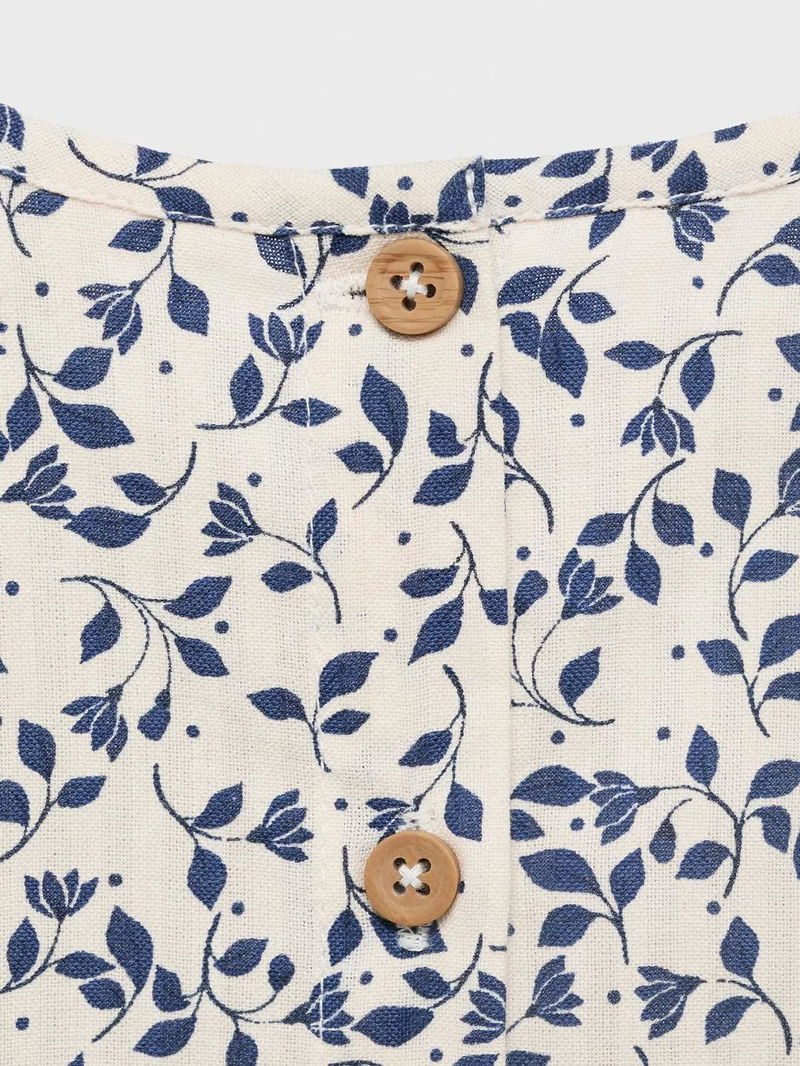 Sleevless cotton blouse with a printed leaf trellis design and wood effect buttons.
