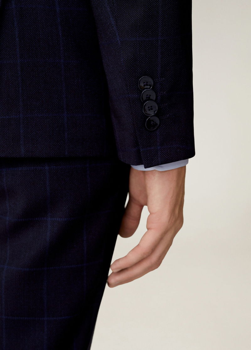 Tailored line, Slim fit, Short design, Check-pattern, Cotton-blend fabric, Lapel with notch, Welt pocket on the chest, Two pockets with flaps on the front, Long buttoned sleeve, Button up, Back slits, Inner lining, Inner pocket, Customizable inside label.