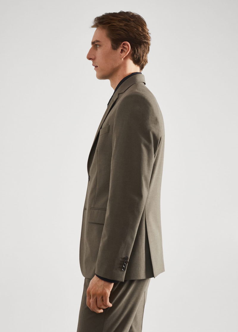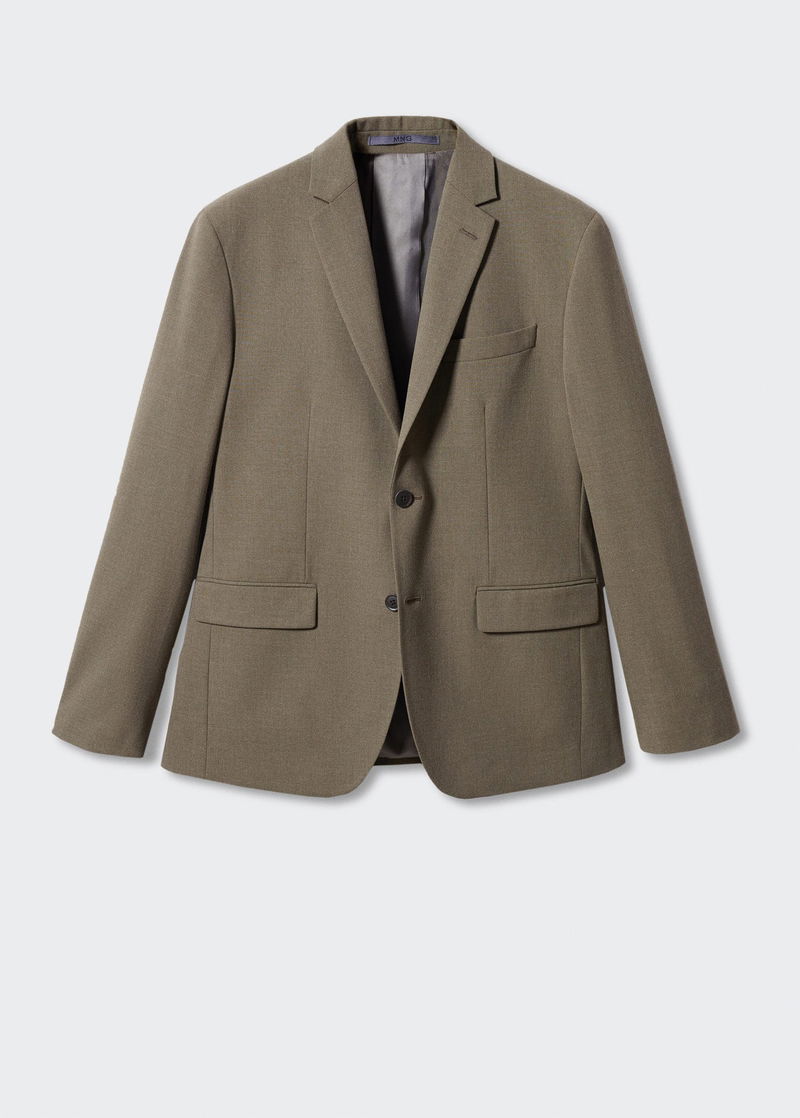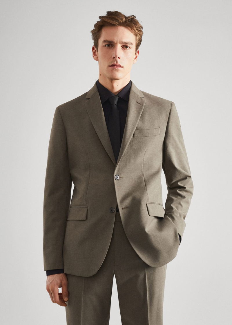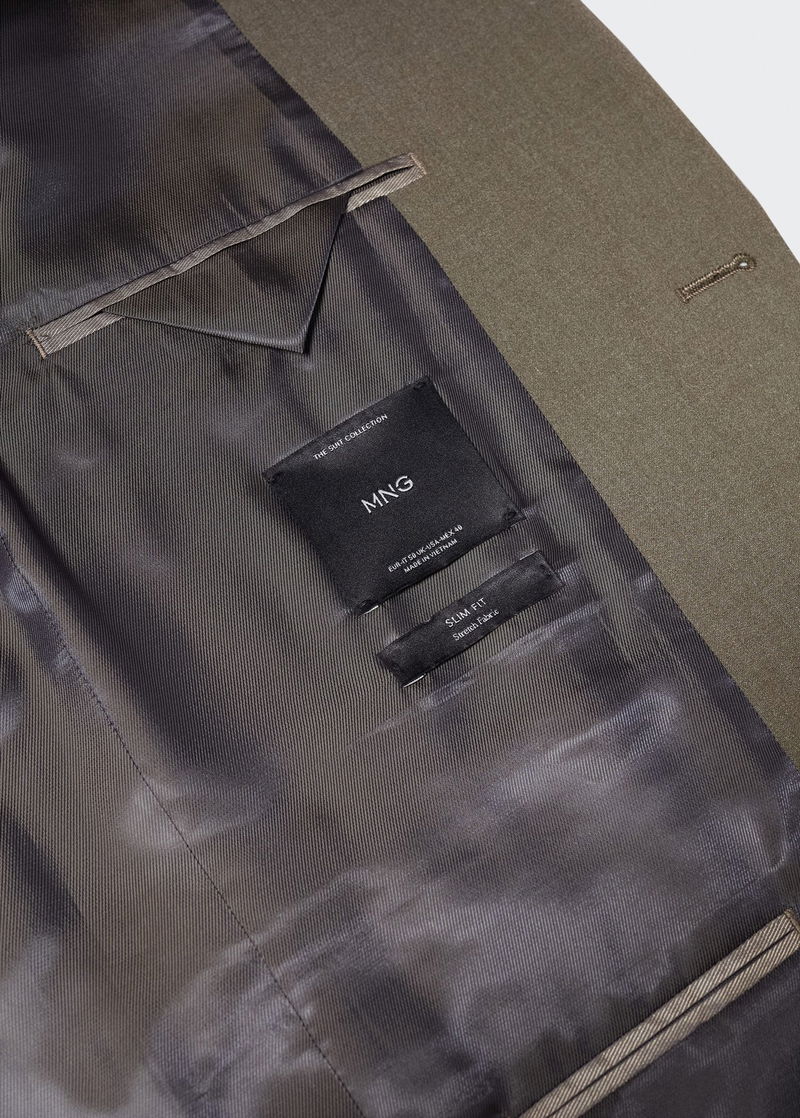 Slim fit, Recycled polyester blend fabric, Lapel with notch, Welt pocket on the chest, Two pockets with flaps on the front, Button up, Long buttoned sleeve, Inner lining, Inner pocket.