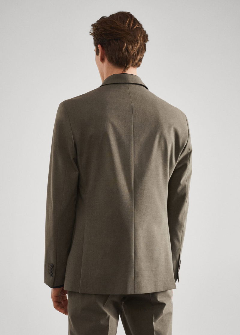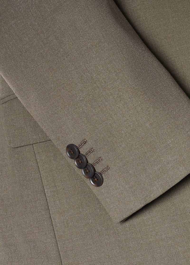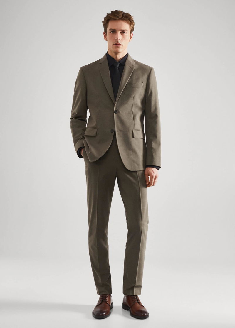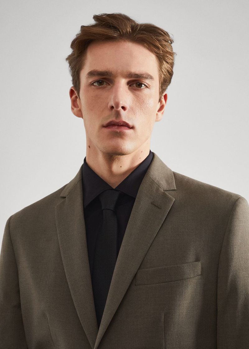 Slim fit, Recycled polyester blend fabric, Lapel with notch, Welt pocket on the chest, Two pockets with flaps on the front, Button up, Long buttoned sleeve, Inner lining, Inner pocket.