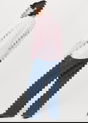 Denim style cotton fabric, Baggy design, Long design, Medium waist, Adjustable buckles, Loops, Zip and one button fastening, Two side pockets, Patch pockets on the back.