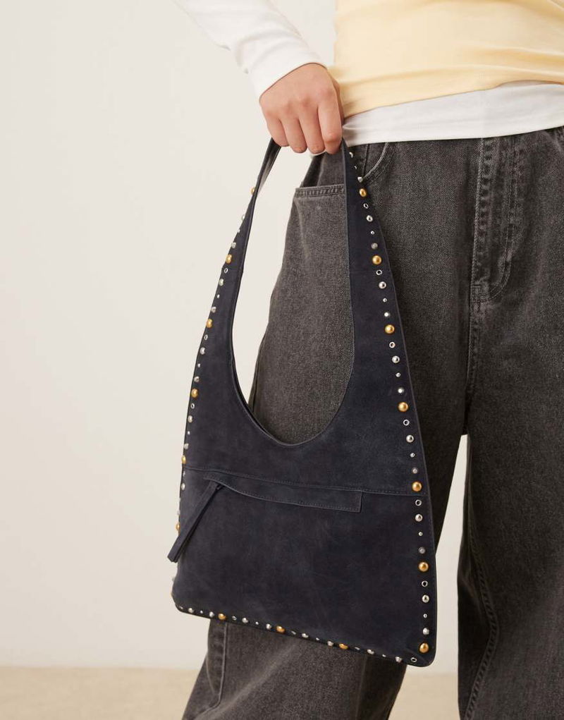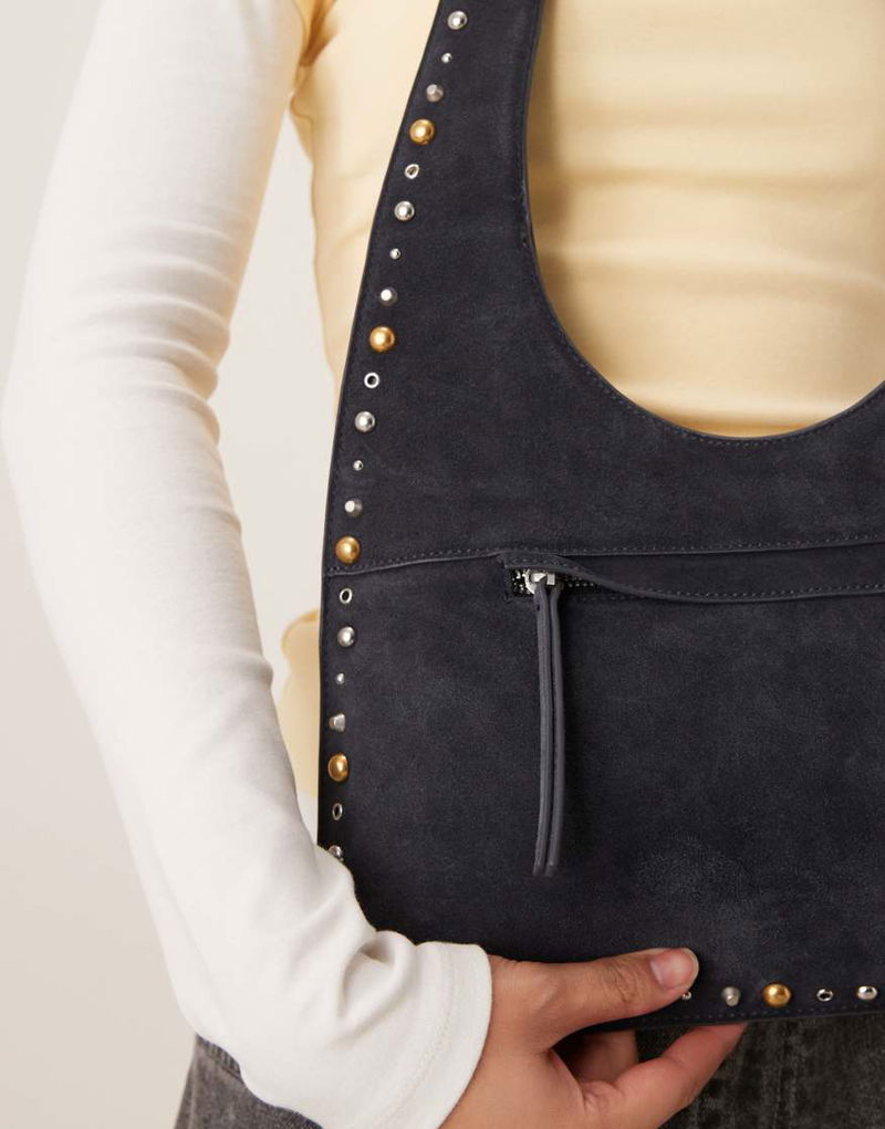 Slouchy Suede Studded Shoulder Bag In Navy