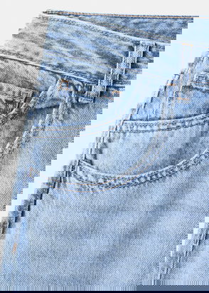 Cotton fabric. Elastic fabric. Denim jeans style. Straight design. Short design. Belt loops. Zip and button fastening. Two side pockets. Two patch pockets on the back.