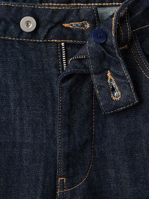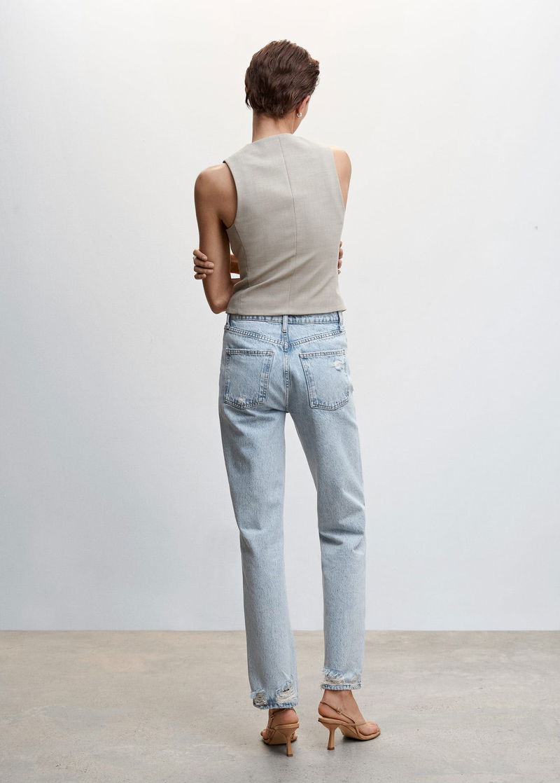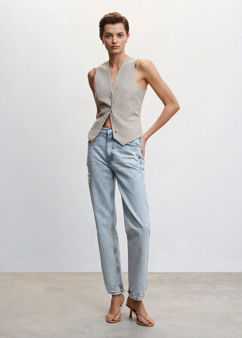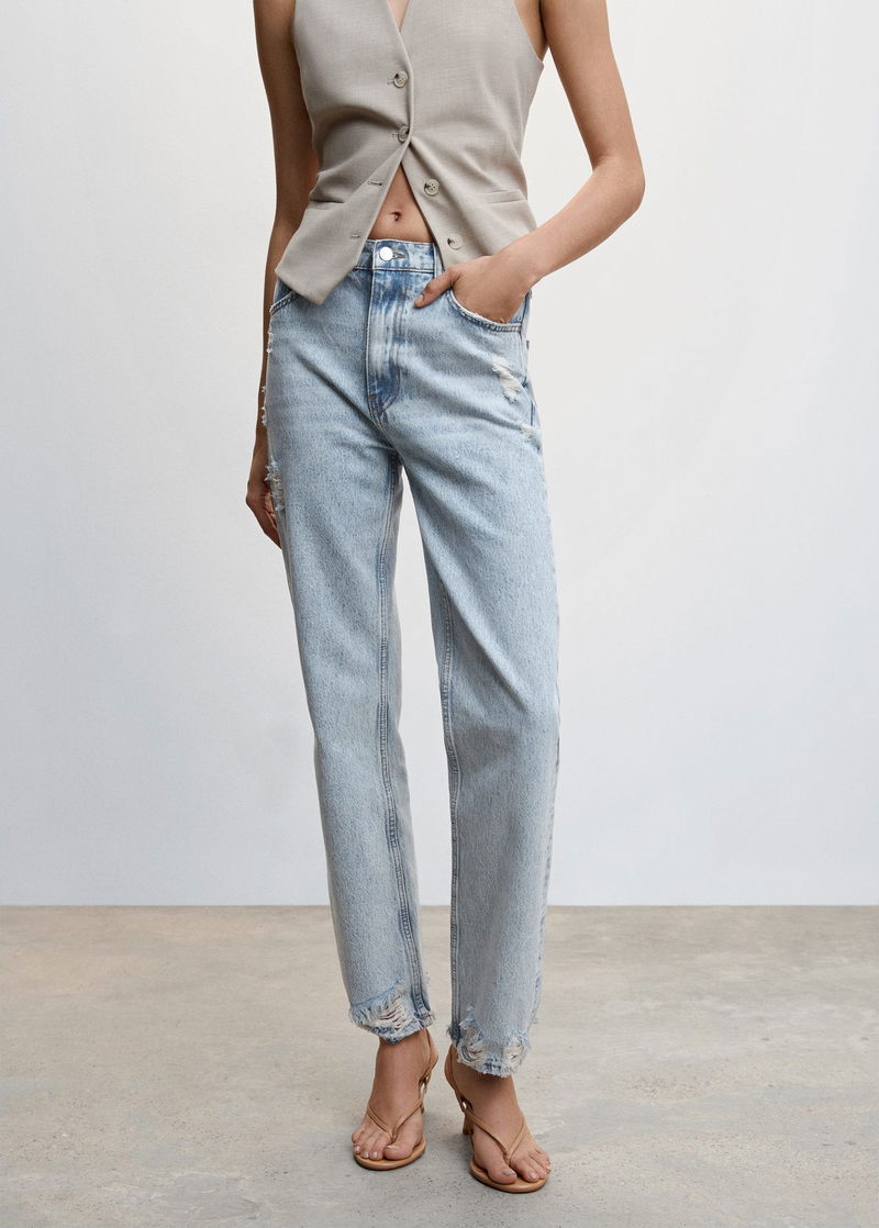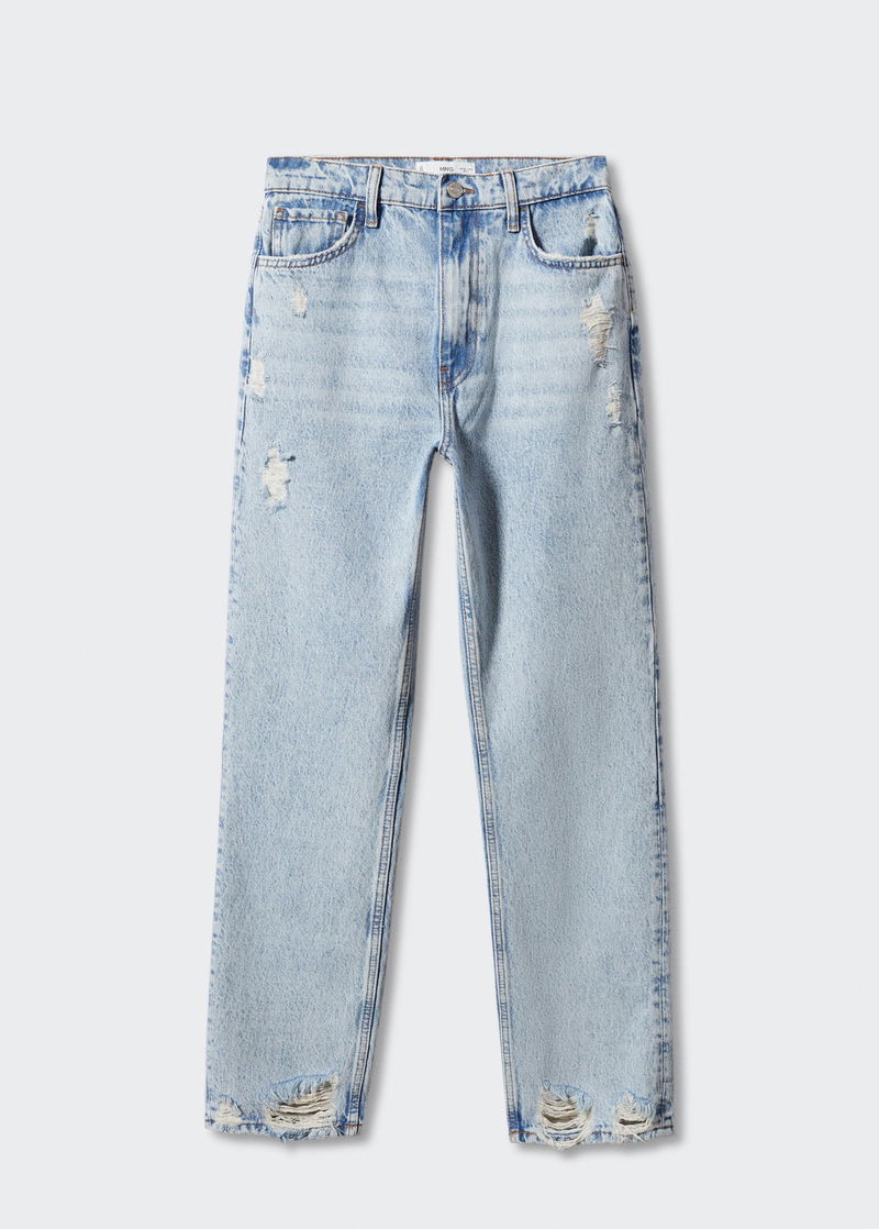 Denim style cotton fabric, Straight design, High waist, Five pockets, Loops, Zip and one button fastening, Decorative rips.