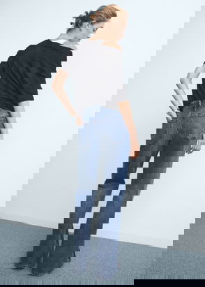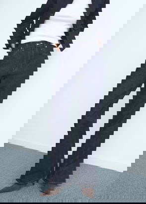 Denim style cotton fabric, Straight design, High waist, Loops, Five pockets, Button up, Forward seams.