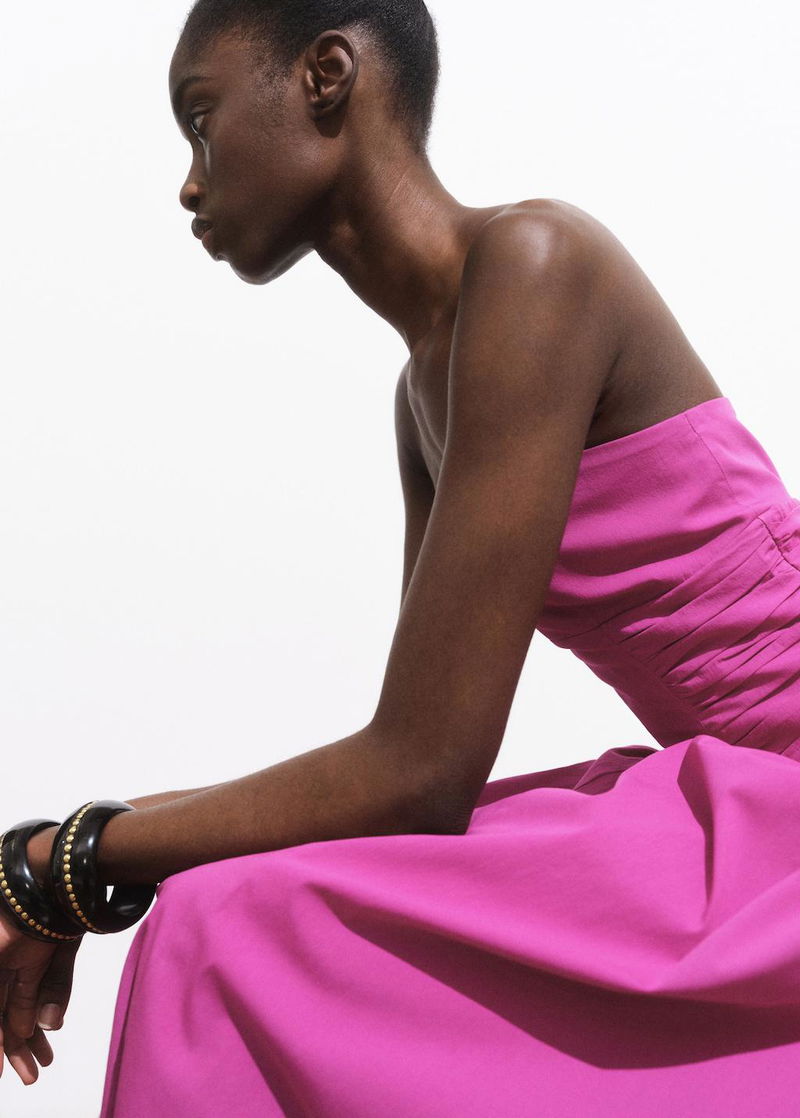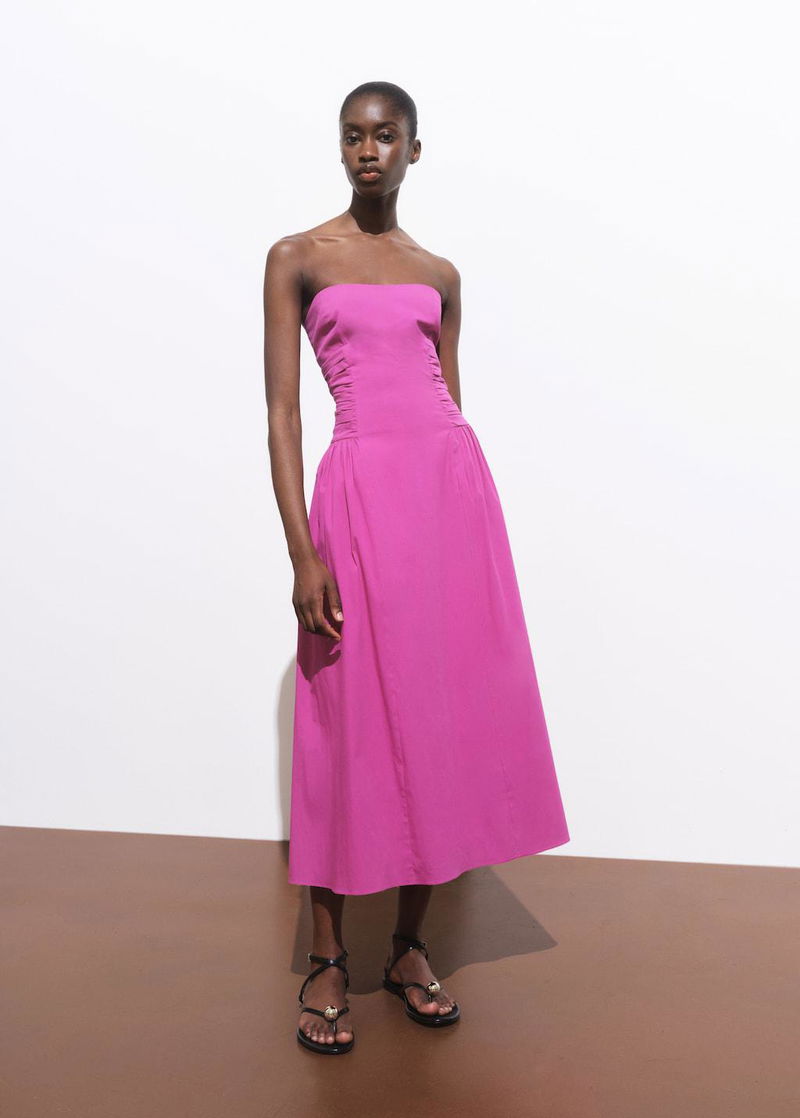 Cotton-blend fabric. Midi design. A-line design. Strapless. Sleeveless. Gathered detail on the sides. Zip fastening on the back section. 100% cotton lining.