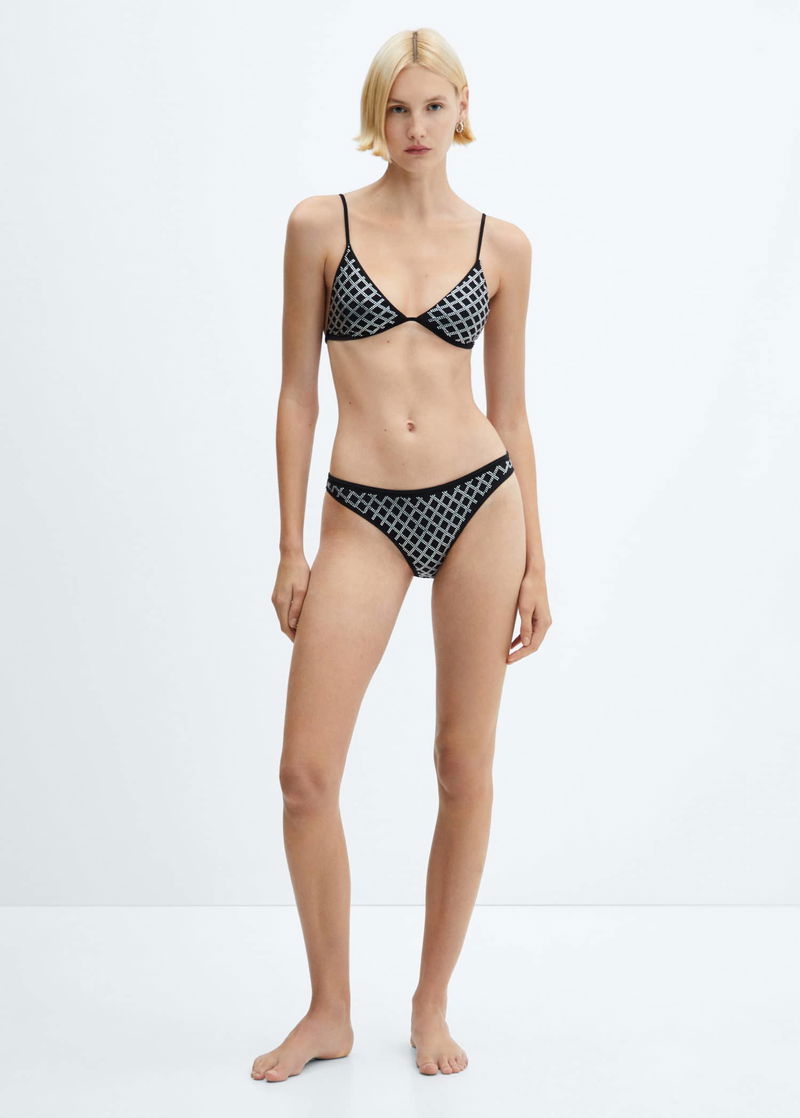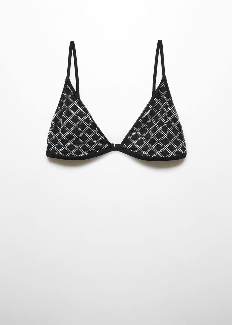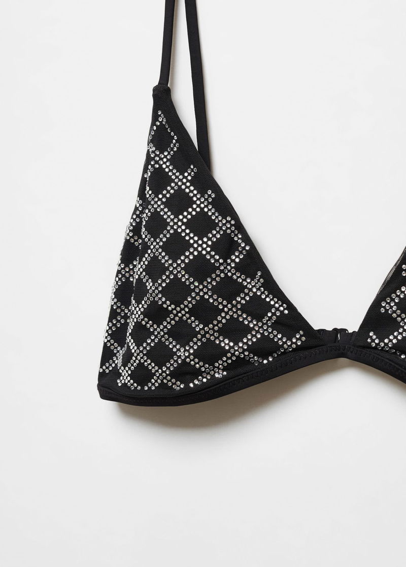 Triangular design, thin straps, hook fastening on the back section, sparkly decorative appliqués, inner lining, co-ord.