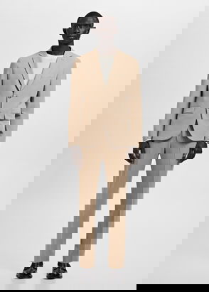 Belt loops. Slim fit. Tailoring collection. Front fastening with double-breasted buttons and zip. Side pockets. Two welt pockets with button at the back. Ironed stripe detail at front and back. Super slim fit. Standard Length. Comfort Stretch: Stretch fabric for added comfort. Stretch fabric providing maximum comfort and freedom of movement. Lightweight Flat Structure. Fabric made of recycled polyester, a durable, breathable, easy-care fibre that provides comfort in use. Mid-rise. Front zip and button closure. Regular Waist. Silhouette Super Slim Fit. Concealed button, hook and zip fastening. Coin pocket. Belt loops. Two front pockets. Two welt pockets at the back. Two side pockets. Concealed coin pocket at hip level. Two welt pockets with button at the back. Comfort: Horizontal and vertical stretch fabric for added comfort.