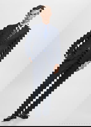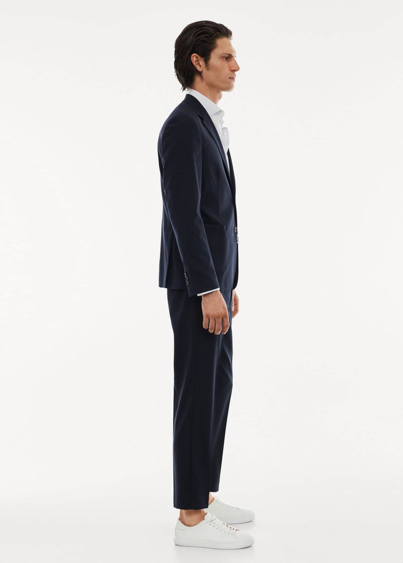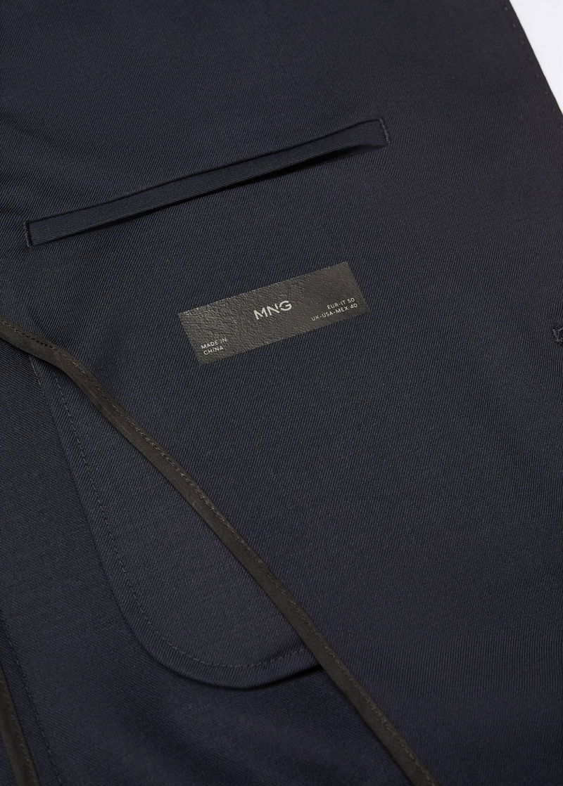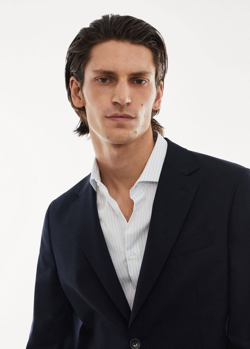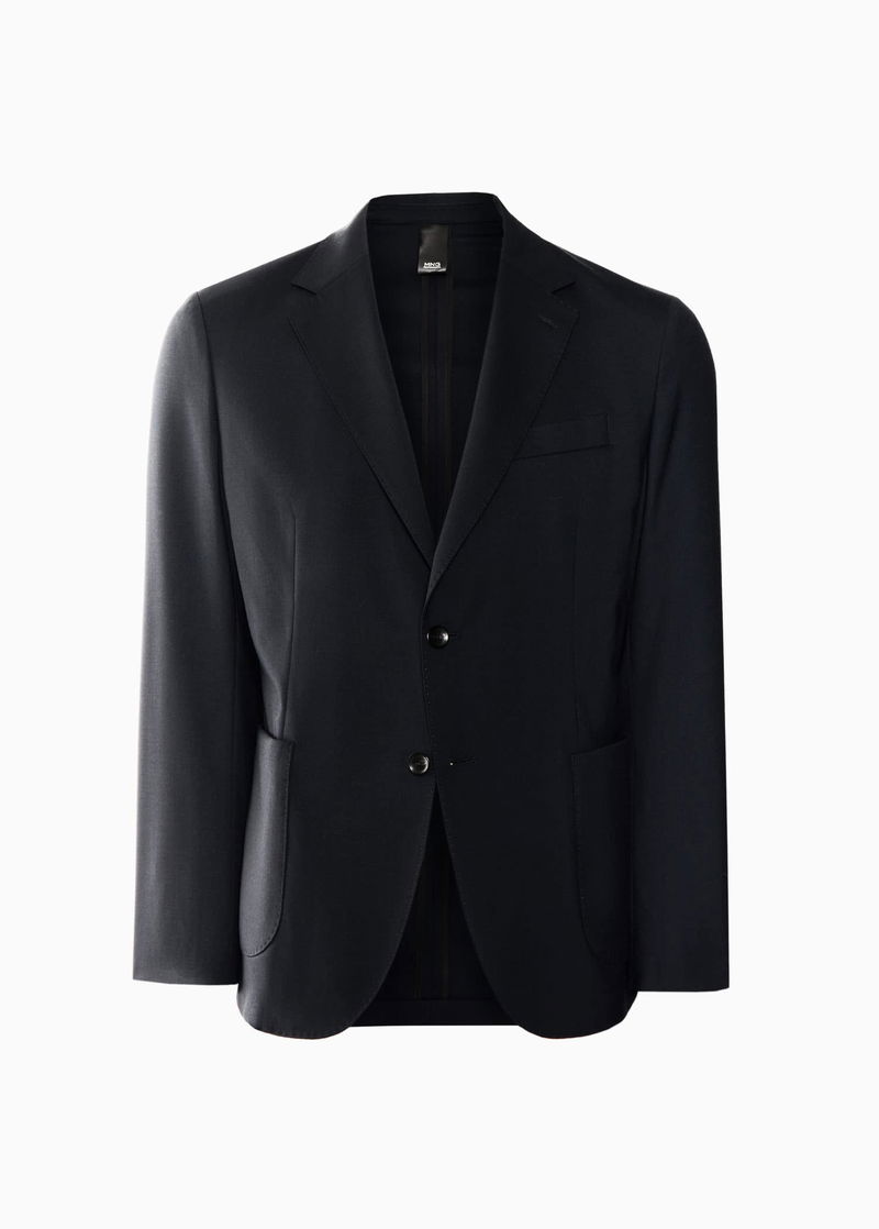 Slim fit, Virgin wool blend fabric, Bi-Strech: bi-directional stretch fabric for added comfort, Machine or hand washable, Lapel with notch, Front button closure, Welt pocket on the chest, Two patch pockets on the front, Long buttoned sleeve, Straight hem, Double back slit.
