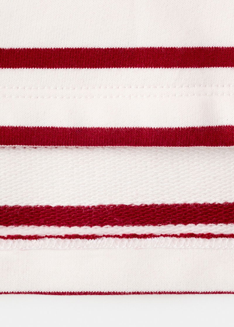 Stripe design. Round neck. Long sleeves. Contrasting cuffs. Hood. Text detail embroidered on the chest.