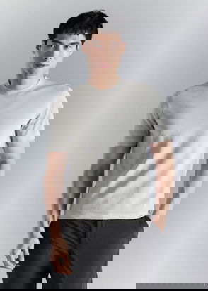 Striped design, Fine knit fabric, Cotton-blend fabric, Short sleeve, Rounded neck.