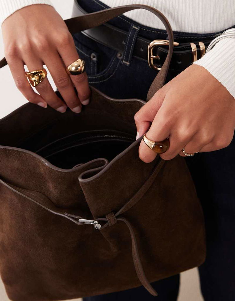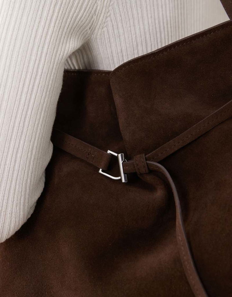 Suede Buckle Detail Bucket Bag In Brown