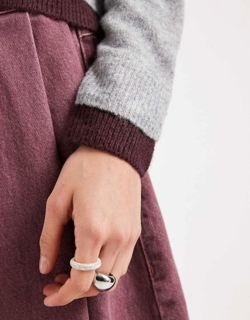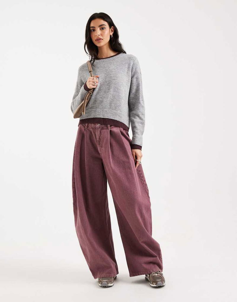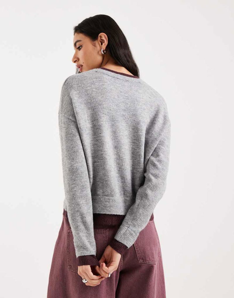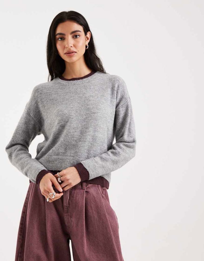 Teen Knitted Jumper In Light Grey With Burgundy Trim