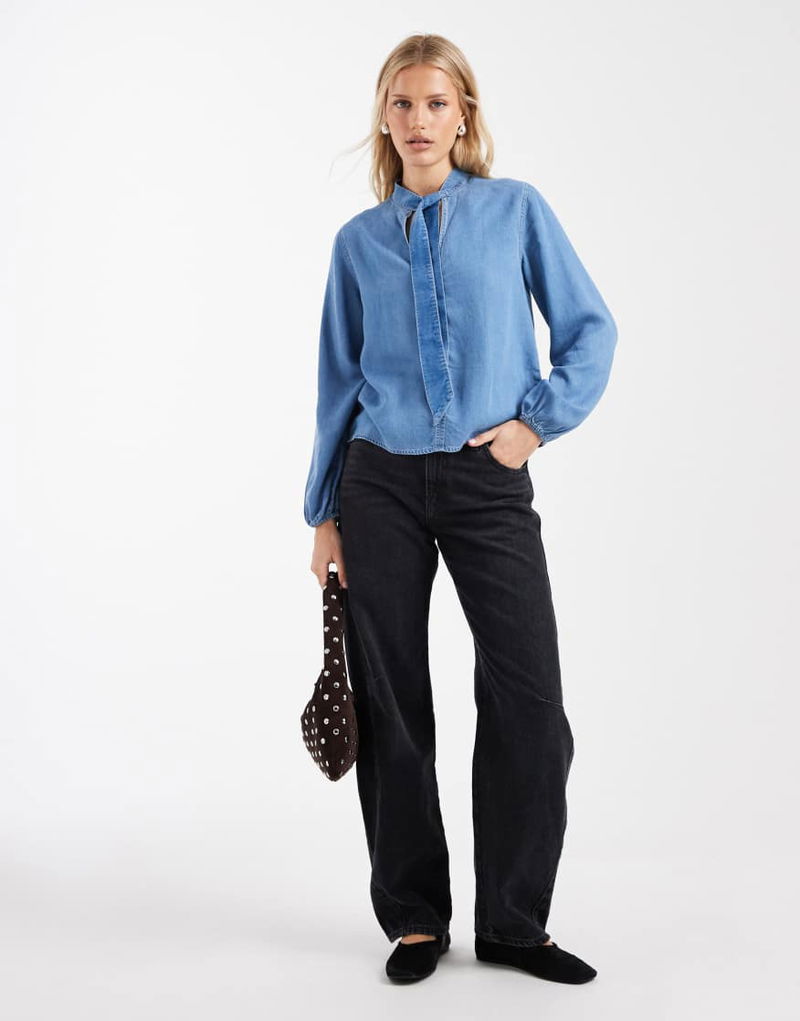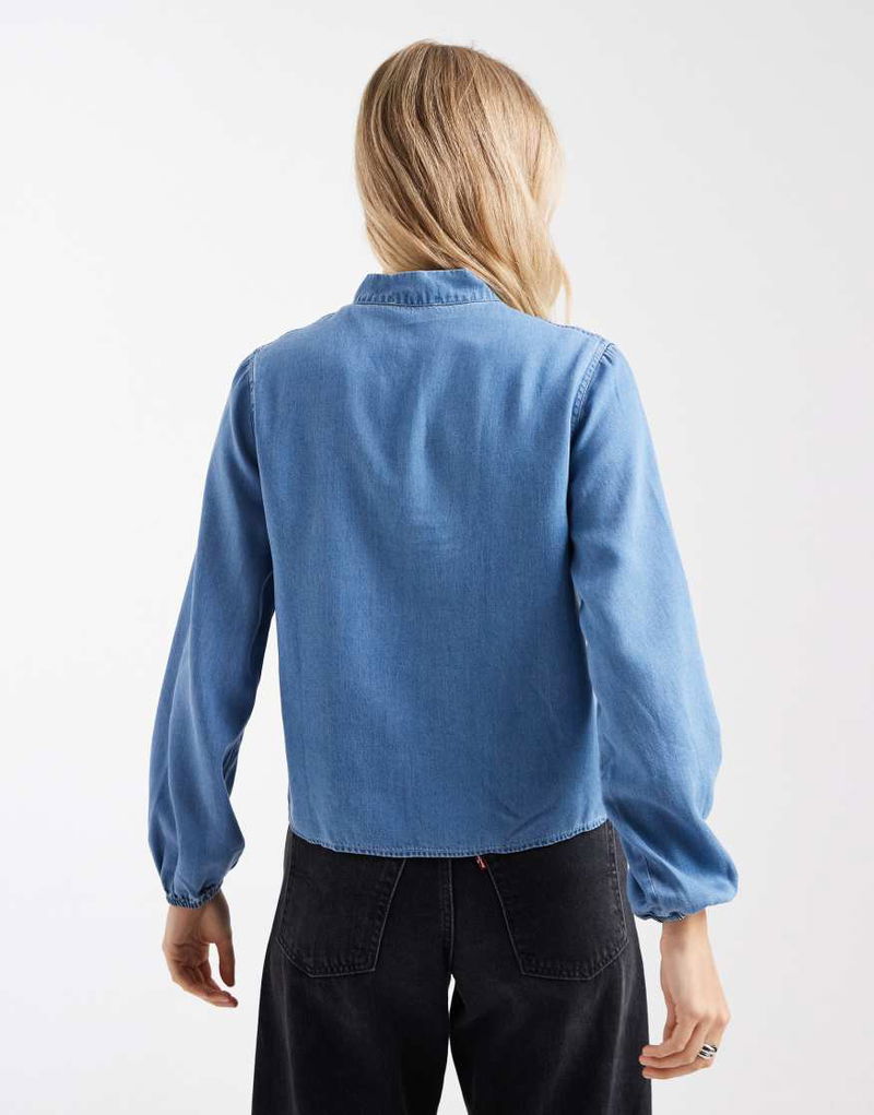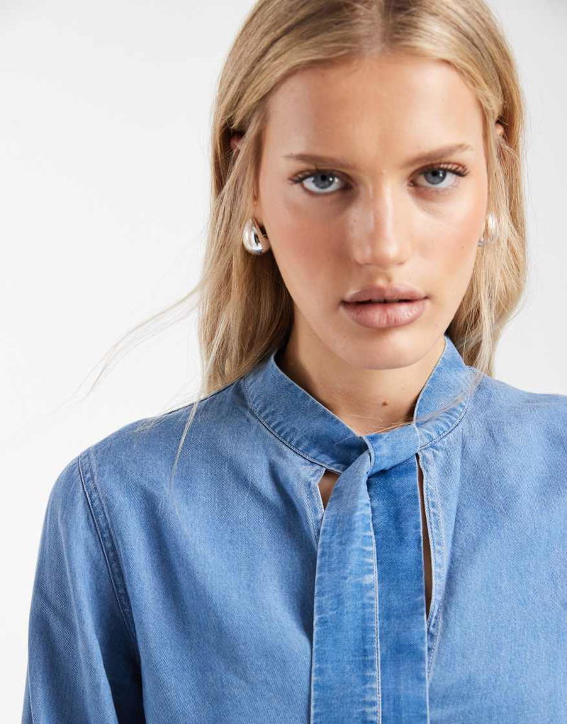 Teen Tie Neck Long Sleeve Denim Blouse In Mid Blue