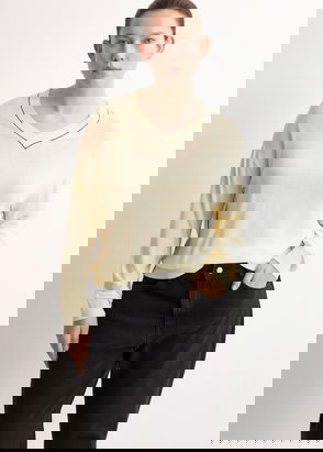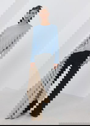Fine knit fabric, Cotton-blend fabric, Striped texture fabric, Straight design, Rounded neck, Long sleeve.