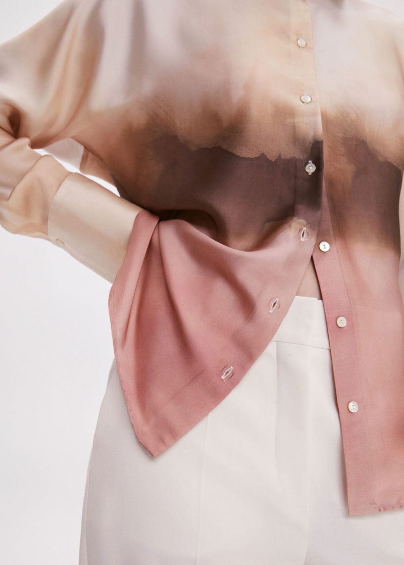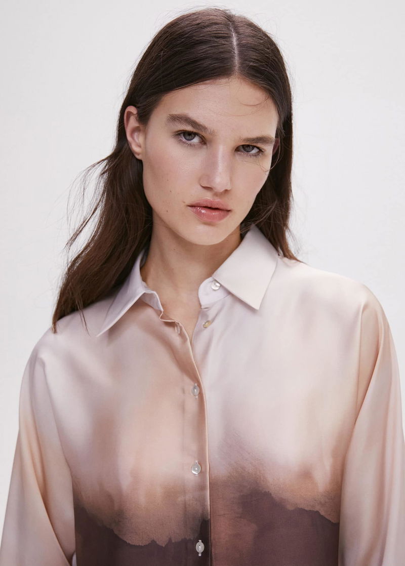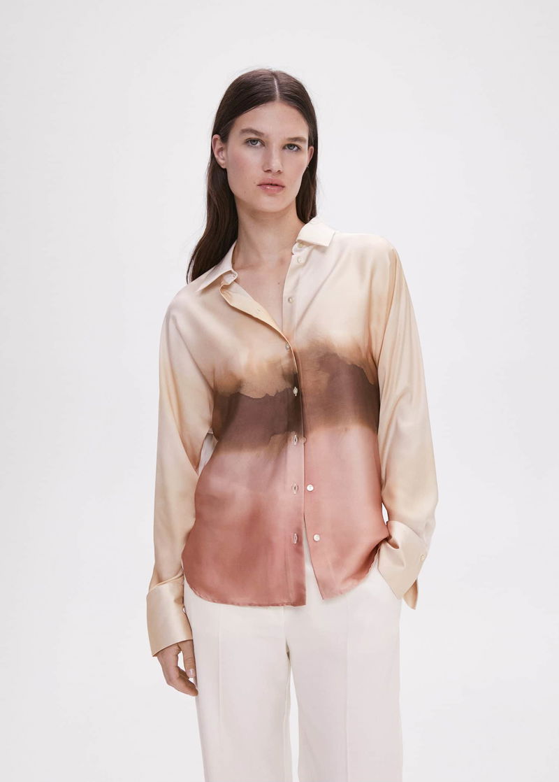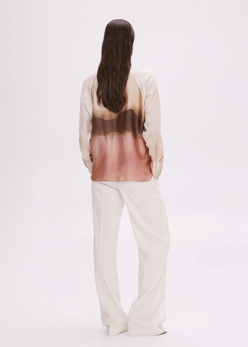 Selection Collection, Flowy fabric, Satin, Tie-dye print, Straight design, Shirt-style collar, Long sleeve with buttoned cuffs.