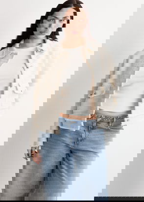 Tweed fabric, Cotton-blend fabric, Straight design, Short design, Rounded neck, Long sleeve, Decorative pockets on the front, Contrast detail.