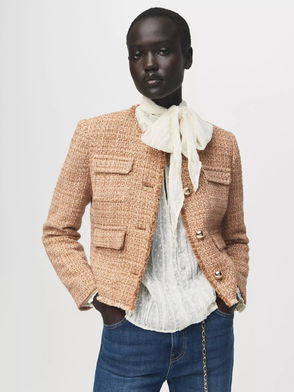 Tweed fabric, textured design, straight design, rounded neck, long sleeve, toggle button fastening, inner lining.