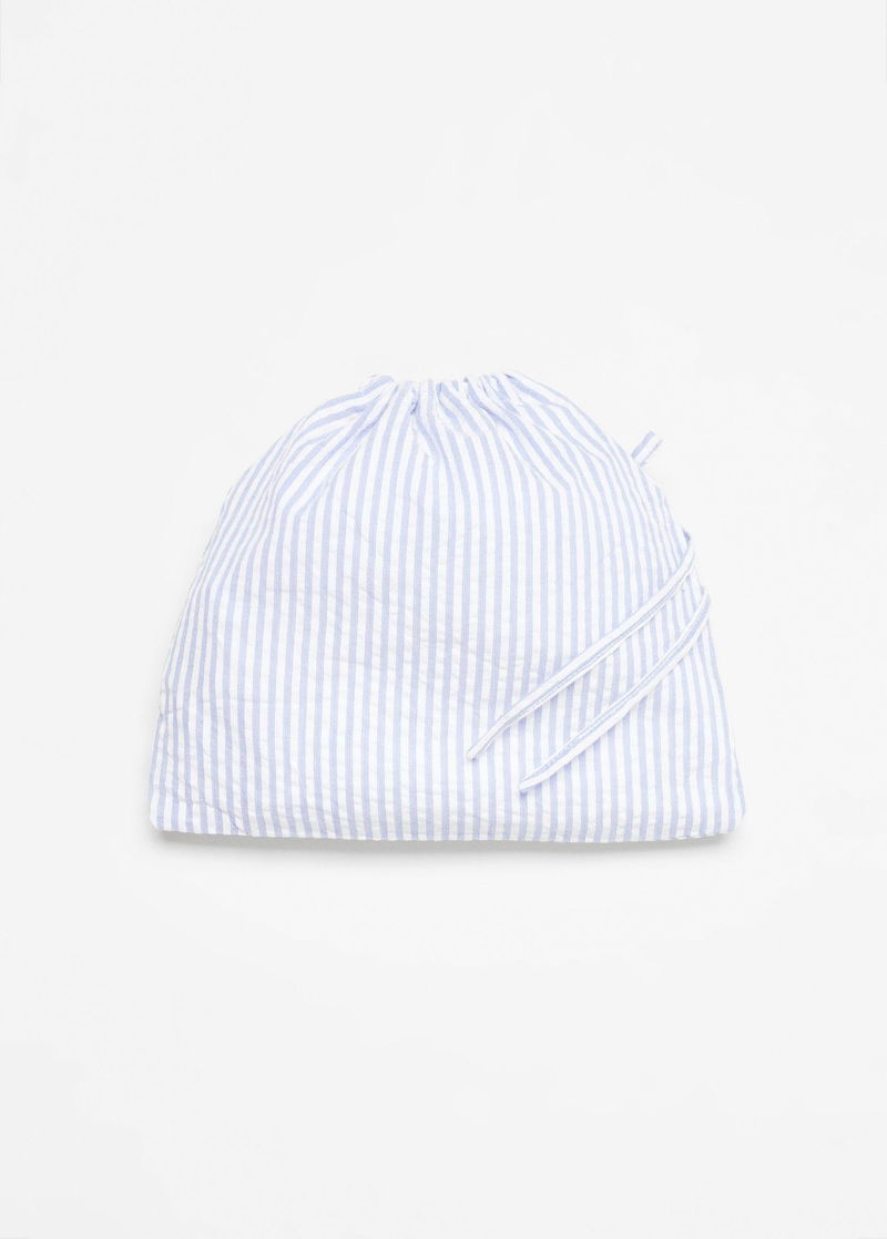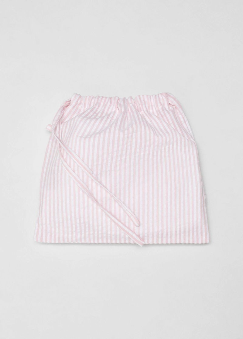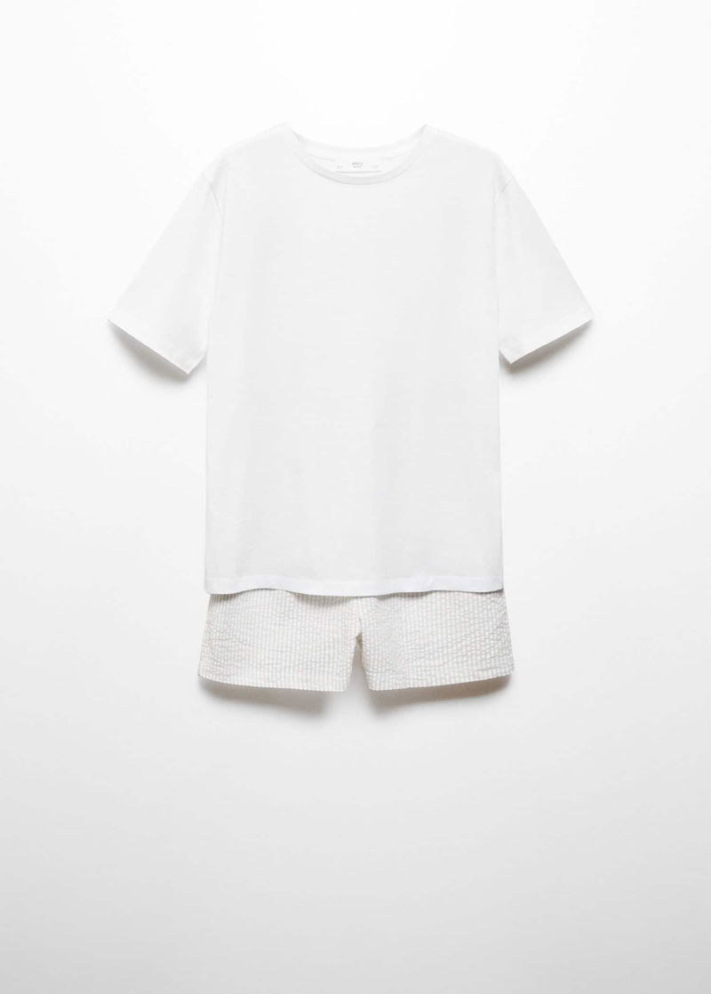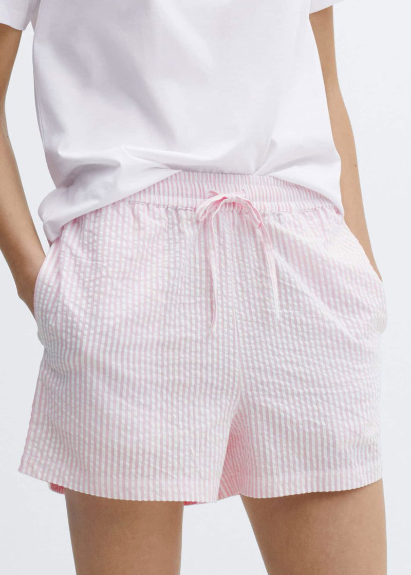 Straight design, Short design, Striped print, Round neck, Short sleeve, Elastic waist with tie closure.