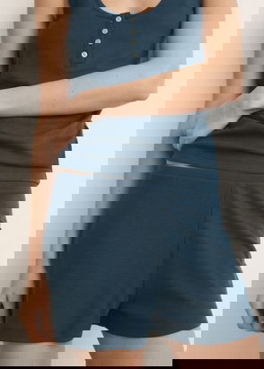 Product on sale. 100% cotton fabric. Seersucker fabric. T-shirt and pyjama trousers set. Short design. Straps. Adjustable drawstring. Striped print. Maximum comfort allowing freedom of movement. Available in different colours. Promotional product.