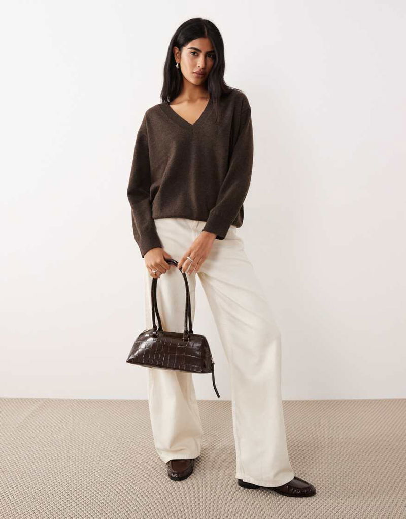 V Neck Long Sleeve Knitted Top In Khaki
