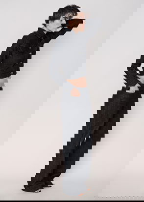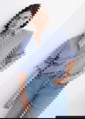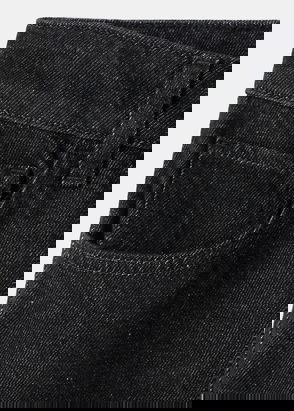 Denim-style cotton fabric. Long design. Flare design. High waist. Belt loops. Five pockets. Button and zip fastening. Interior length 87.5 cm. Comfort fabric with elasticity.