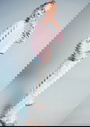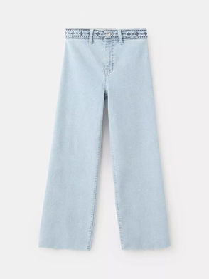 Cotton fabric. Elastic fabric. Long design. Wide-leg design. Waist Low Waist. Belt loops. Zip and button fastening. Coin pocket. Two side pockets. Seam detail.