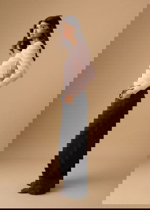 Denim-style cotton fabric. Long design. Wide-leg design. Mid-rise. Wrap belt. Belt loops. Five pockets. Asymmetrical front closure with zip and buttons.